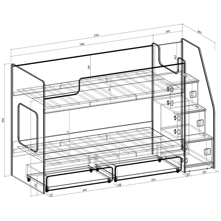 код 141563Габаритные размеры: 2154x803x1314 мм. Кровать укомплектована 2-мя выдвижными ящиками.