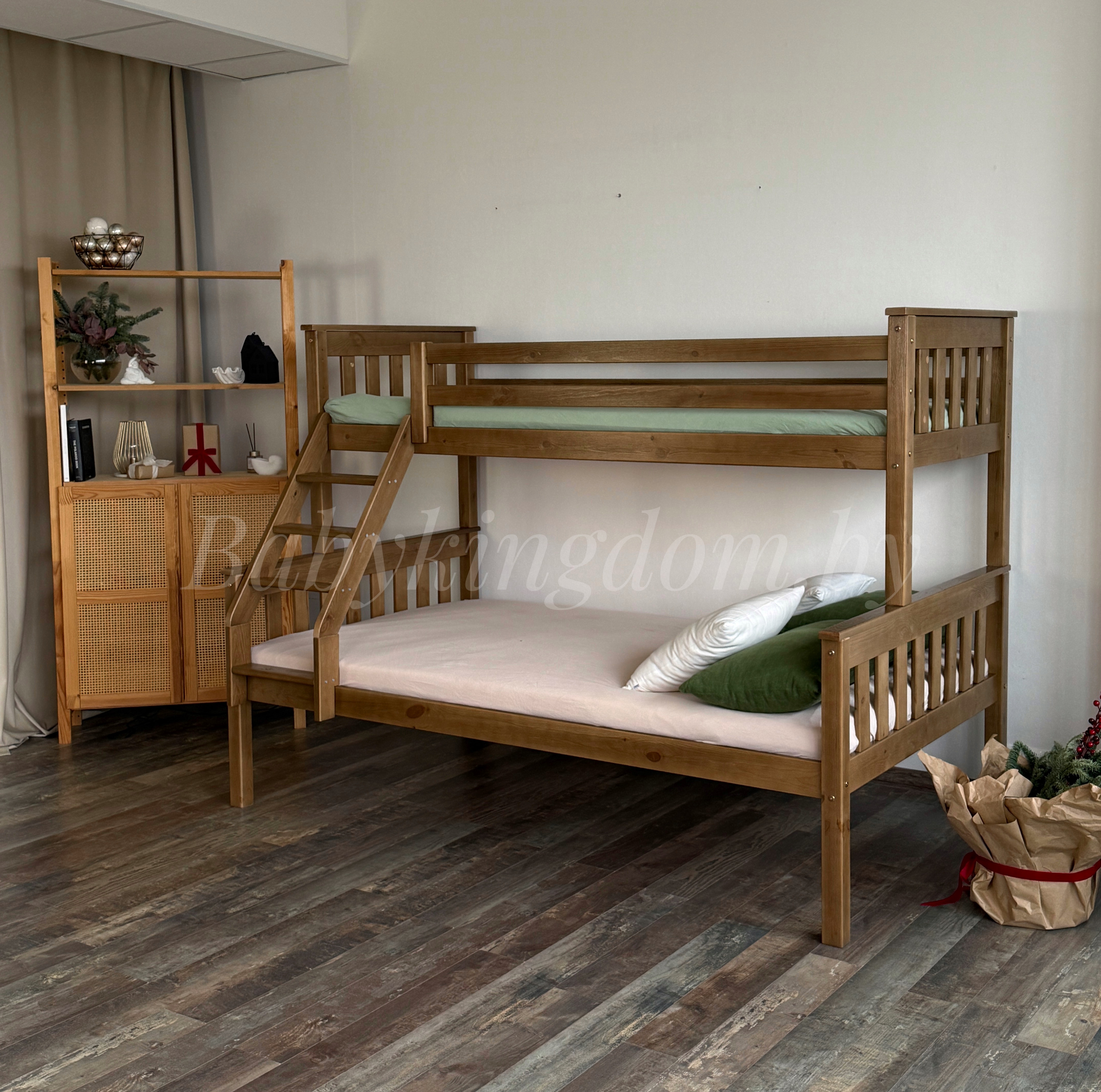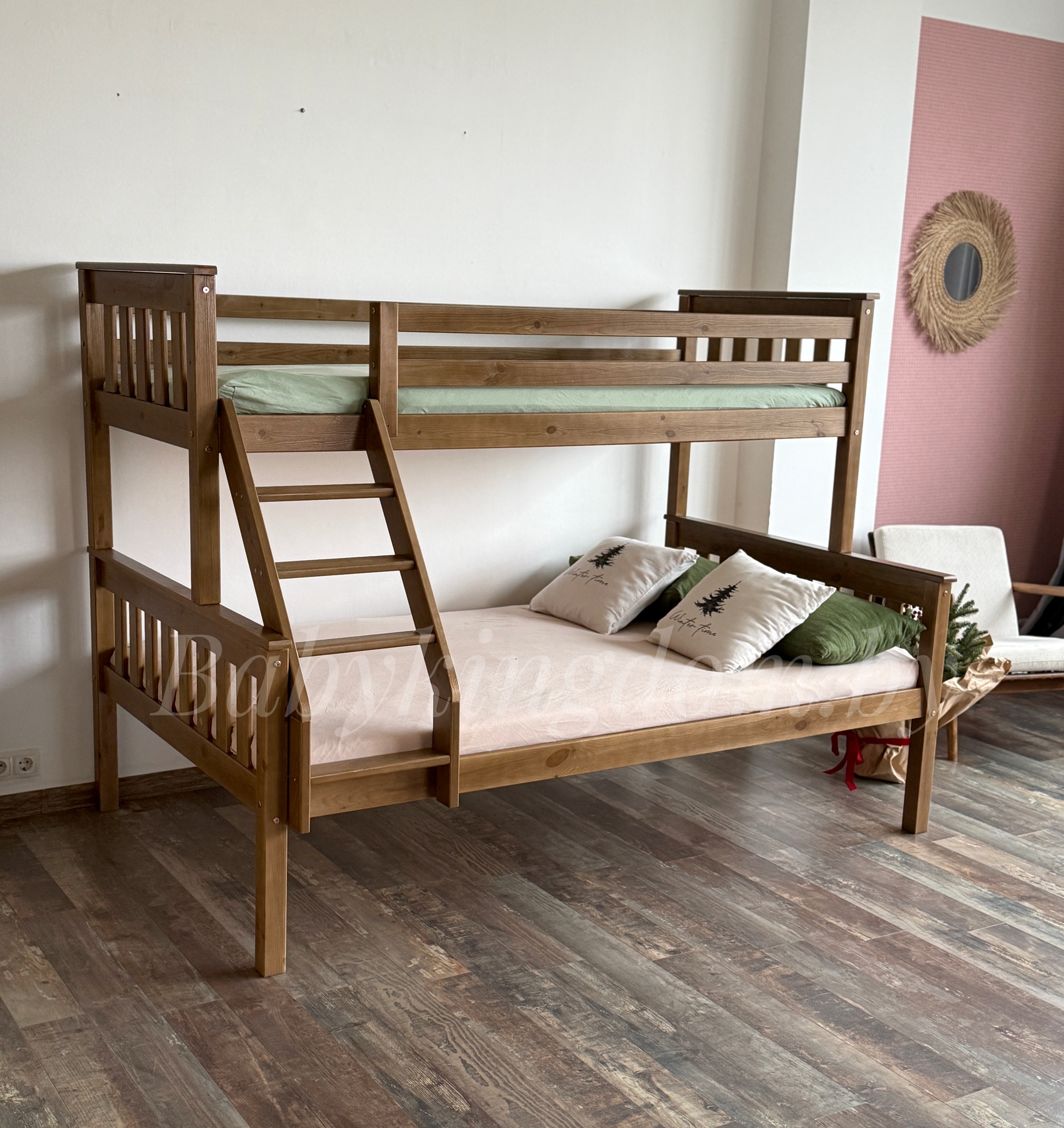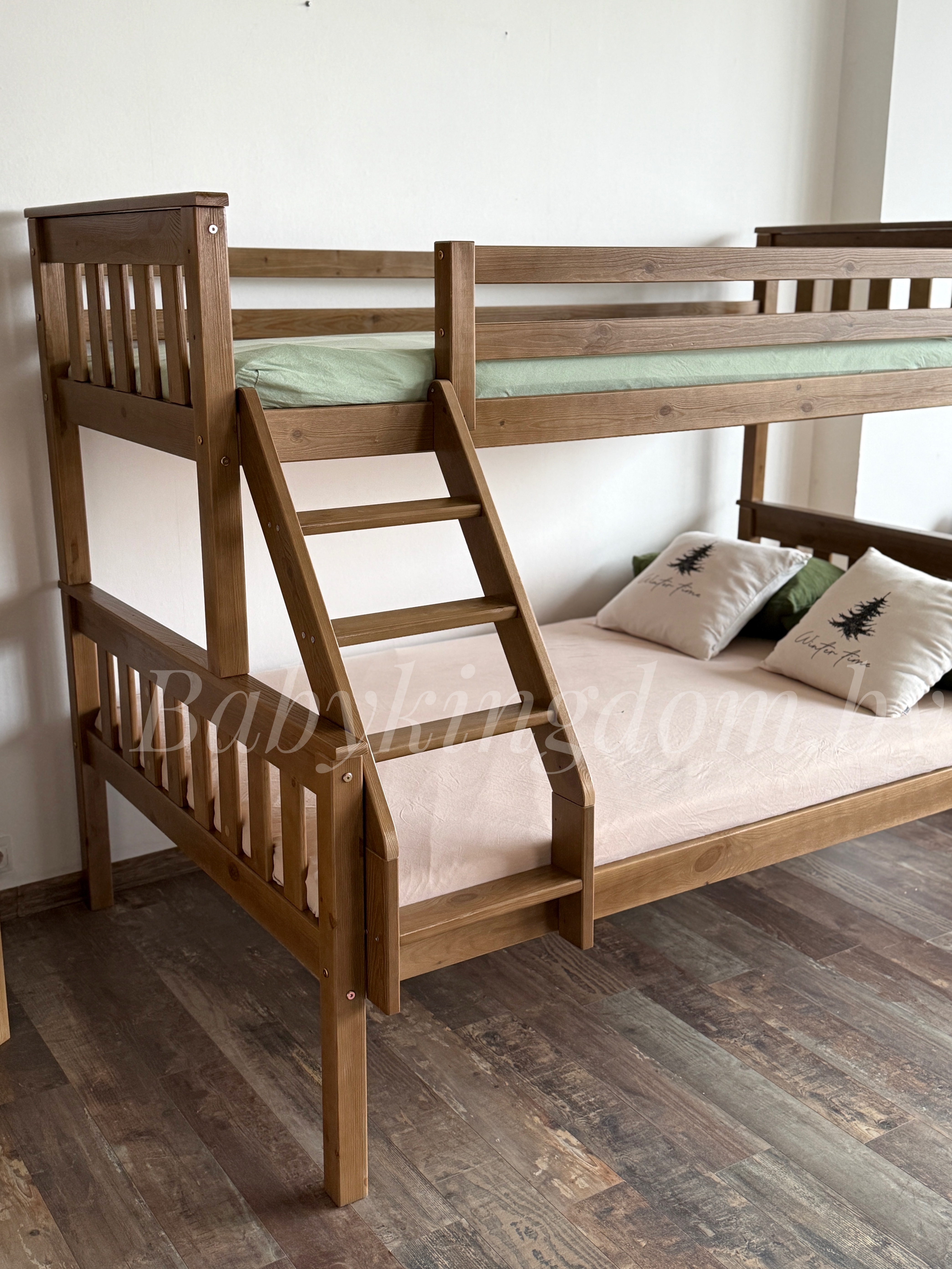 Ищите двухъярусную кровать с широким спальным местом? Тогда обратите особое внимание на модель «Мальм-люкс» из массива сосны. Эта уникальная двухъярусная модель состоит из двух полноценных односпальных кроватей, которые при первом же желании можно разъединить и создать две спальные зоны, не зависящие друг от друга. Вторая исключительная особенность «Мальм-люкс» – это ширина спальных мест. Нижний ярус имеет габариты полноценной полутороспальной кровати шириной 120,140 см. Длина кровати 2 метра позволяет с удобством расположиться не только детям, но и взрослому человеку! Верхний ярус немного уже –80, 90 см. Он является представителем классической односпальной кровати. Лестница для подъема может быть закреплена как с правой, так и с левой стороны!