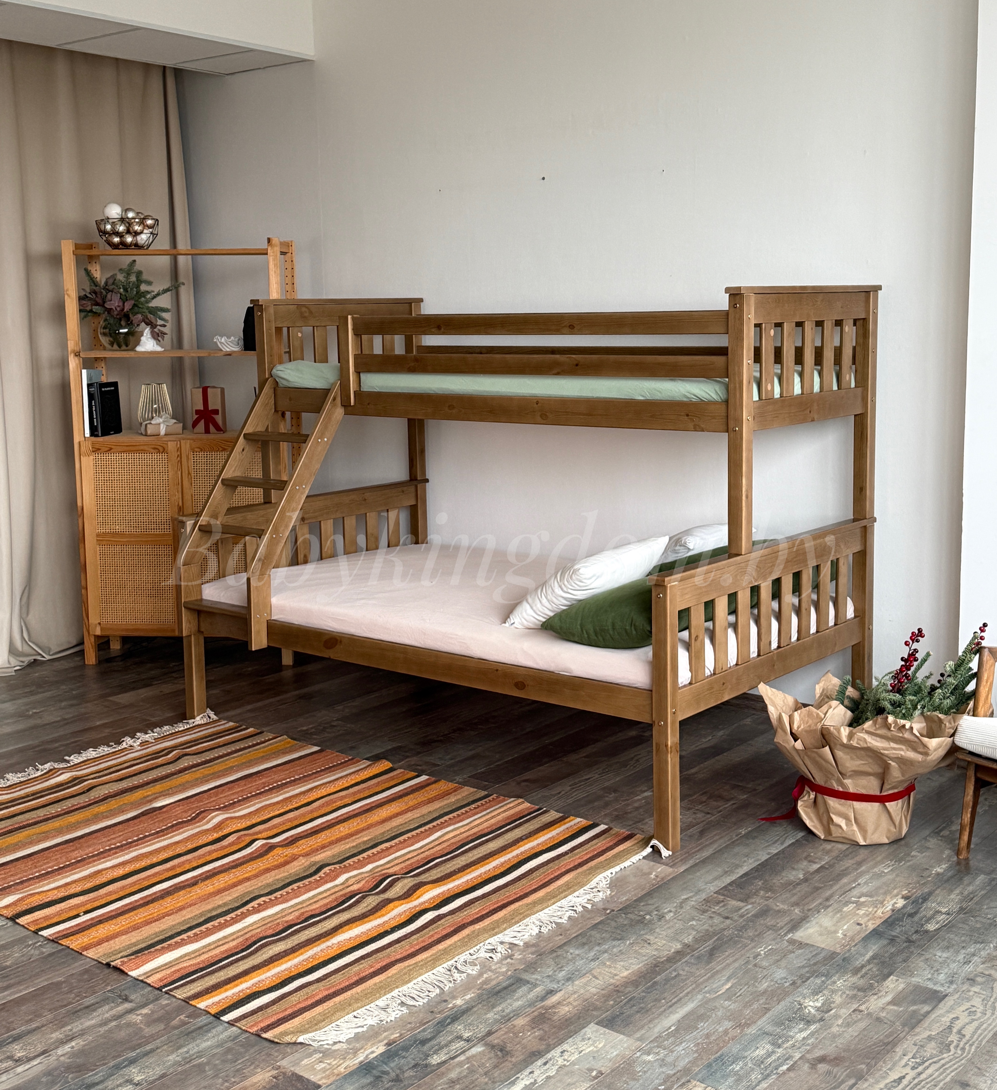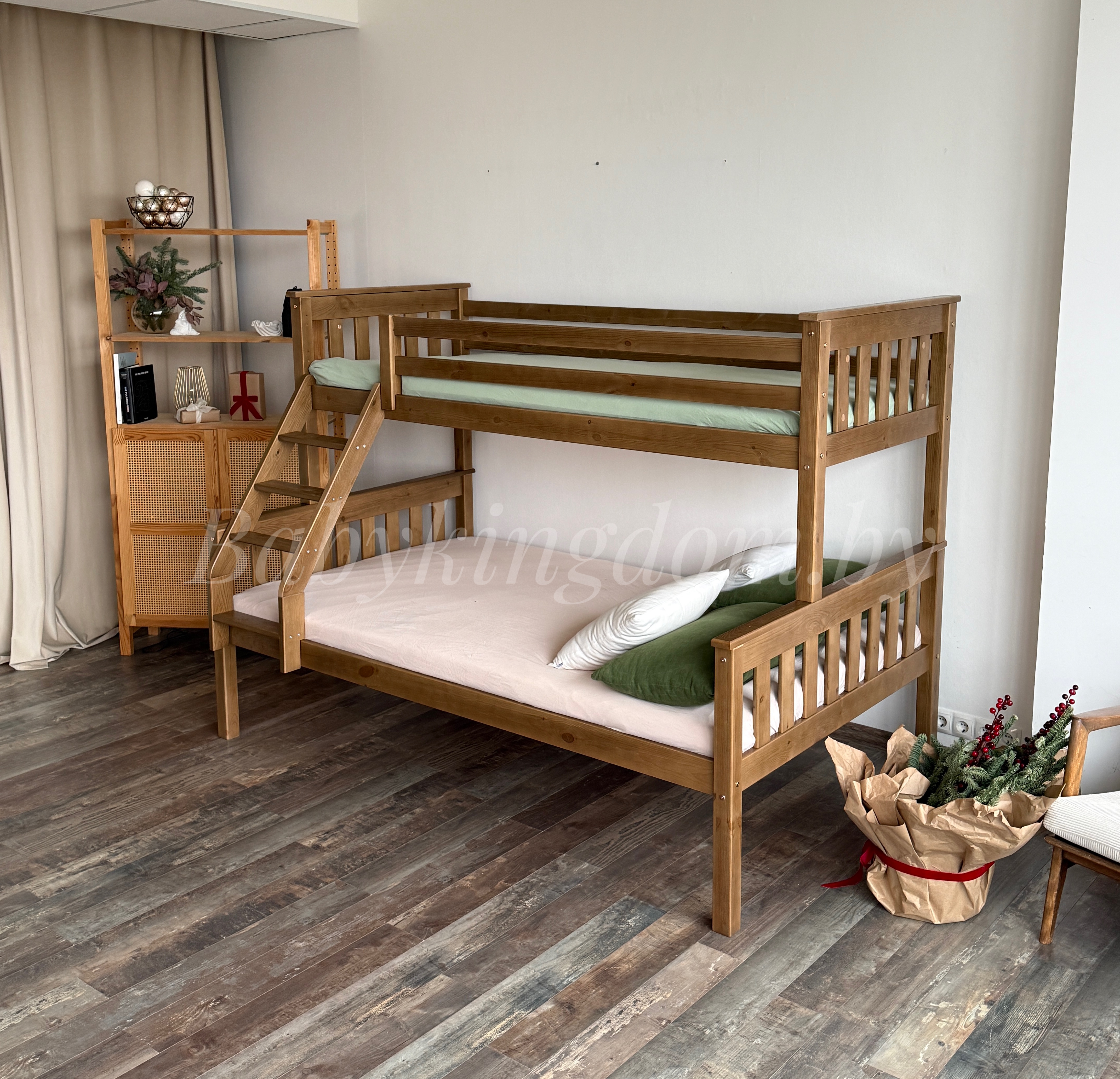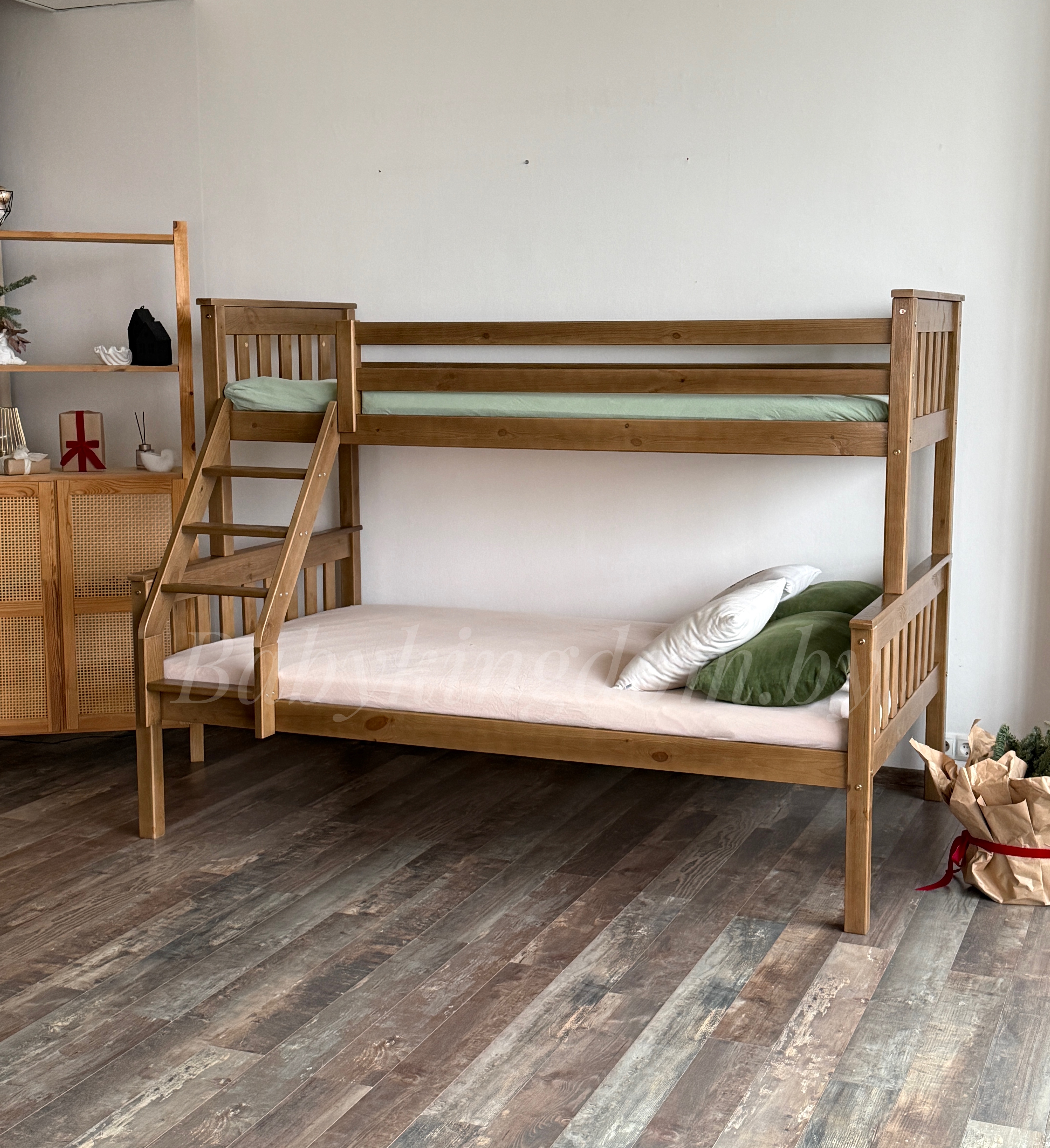 Ищите двухъярусную кровать с широким спальным местом? Тогда обратите особое внимание на модель «Мальм-люкс» из массива сосны. Эта уникальная двухъярусная модель состоит из двух полноценных односпальных кроватей, которые при первом же желании можно разъединить и создать две спальные зоны, не зависящие друг от друга. Вторая исключительная особенность «Мальм-люкс» – это ширина спальных мест. Нижний ярус имеет габариты полноценной полутороспальной кровати шириной 120,140 см. Длина кровати 2 метра позволяет с удобством расположиться не только детям, но и взрослому человеку! Верхний ярус немного уже –80, 90 см. Он является представителем классической односпальной кровати. Лестница для подъема может быть закреплена как с правой, так и с левой стороны!