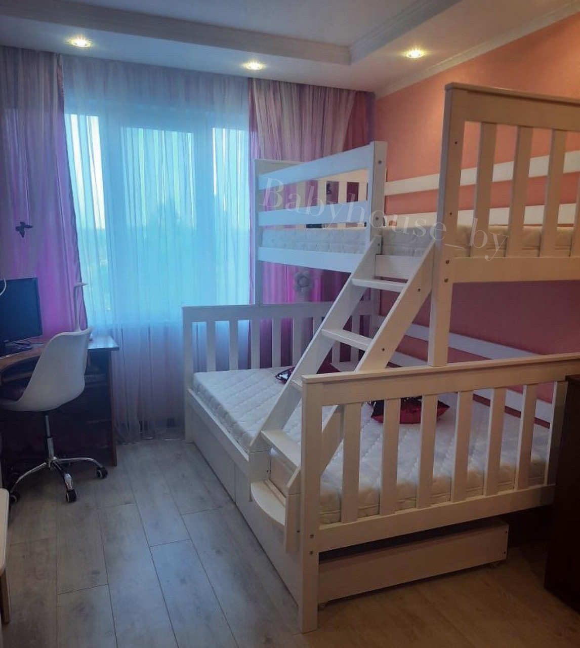 Спальное место: 90х200 см. Материал: массив сосны. В комплекте: выдвижной ящик 2шт., бортик.