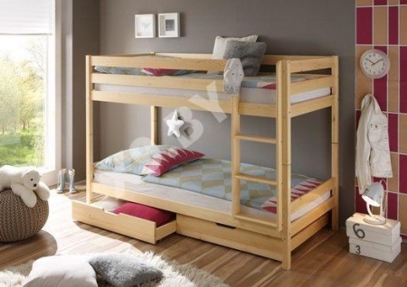 Белая двухъярусная кровать из массива с двумя ящиками для белья.