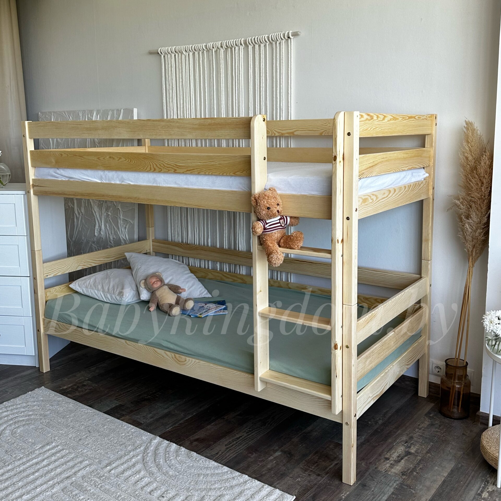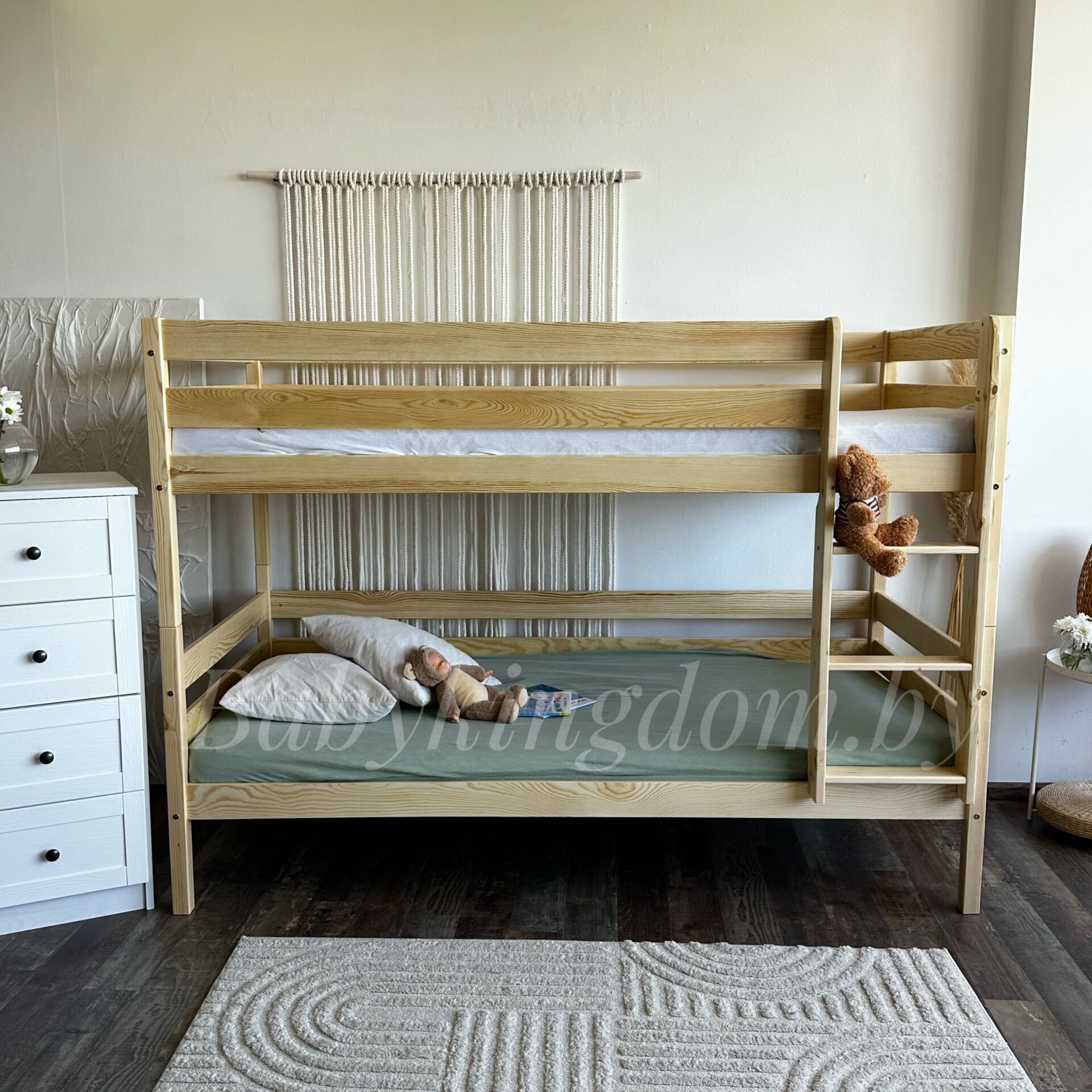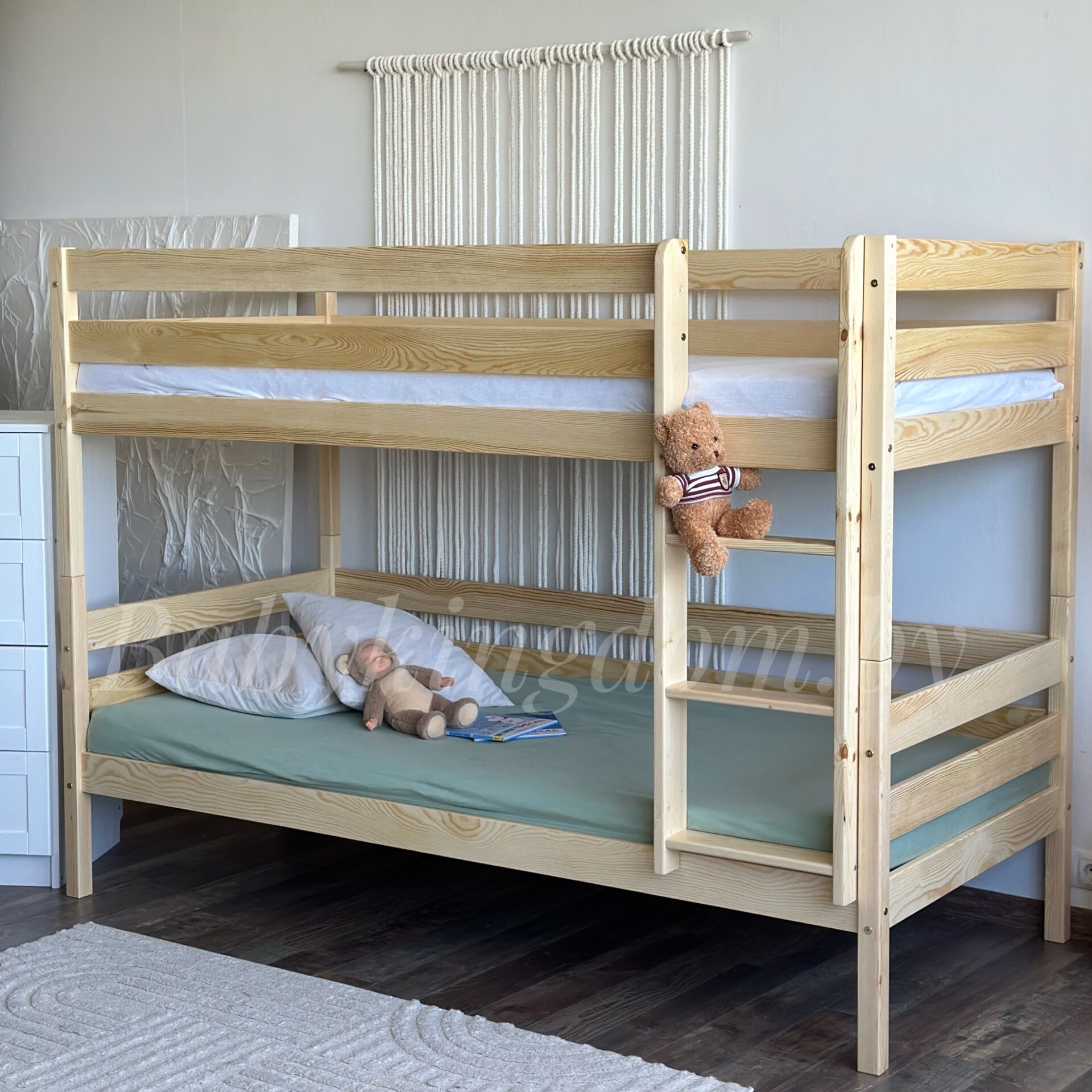 Кровать выполнена из массива сосны (каркас и фасад). Кровать окрашена абсолютно безопасной краской на водной основе, так что вы можете быть спокойны за здоровье и самочувствие вашего ребенка!