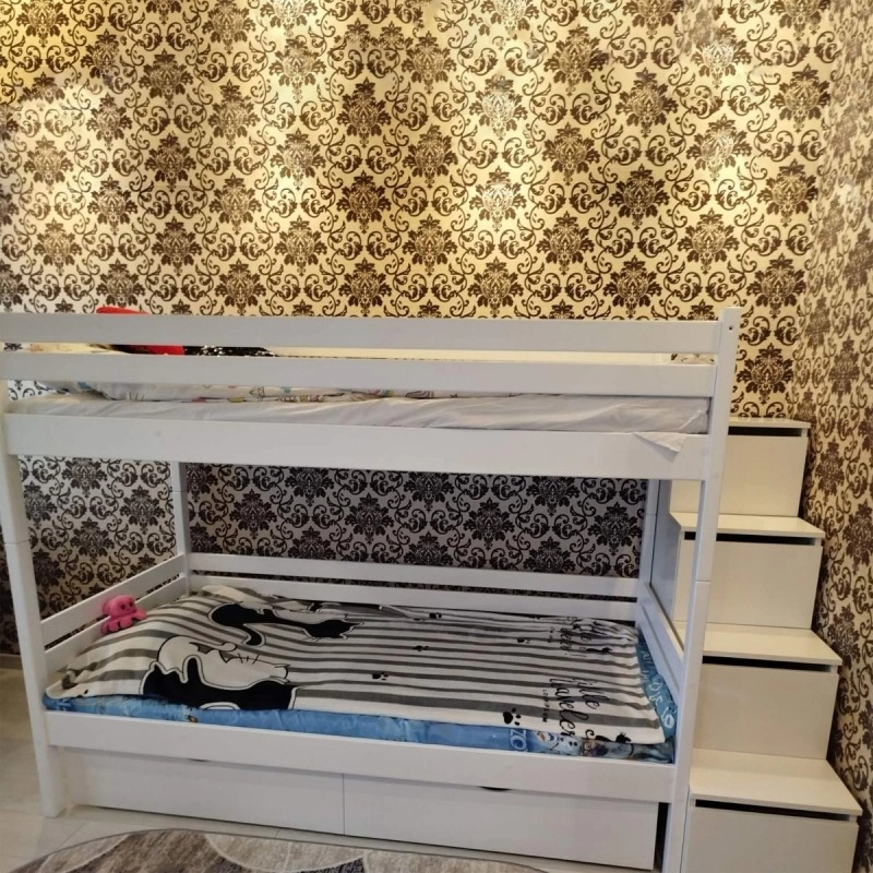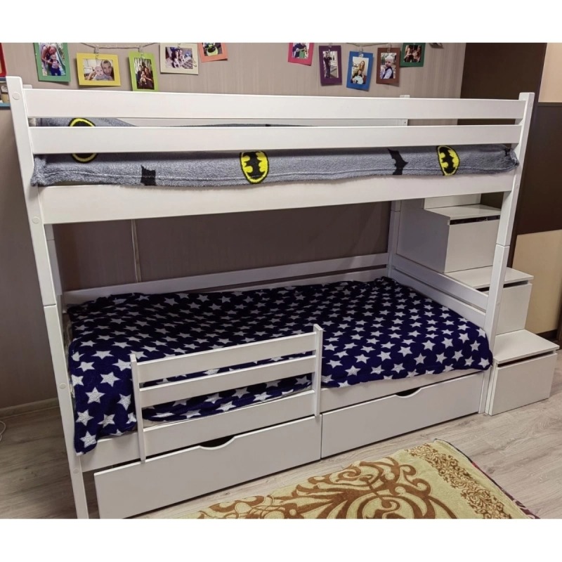 Кровать выполенена из березовой фанеры - прочным и безопасным материалом, который выдерживает большую нагрузку. Можно доукомплектовать бортиком и ящиками. Бортик можно поставить с любой стороны. Большое расстояние между ярусами гарантирует больший комфорт и удобство.