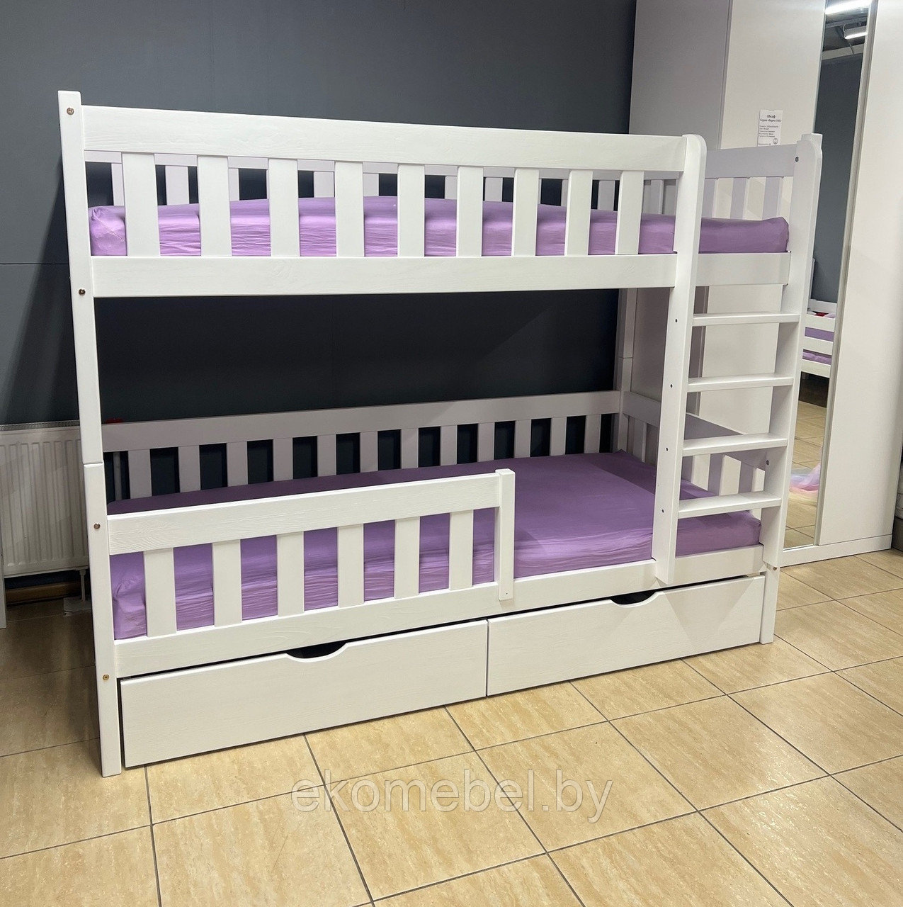 Спальные места: 80х180, 90х200 см. Материал: массив сосны. В комплекте: выдвижной ящик 2 шт., бортик.