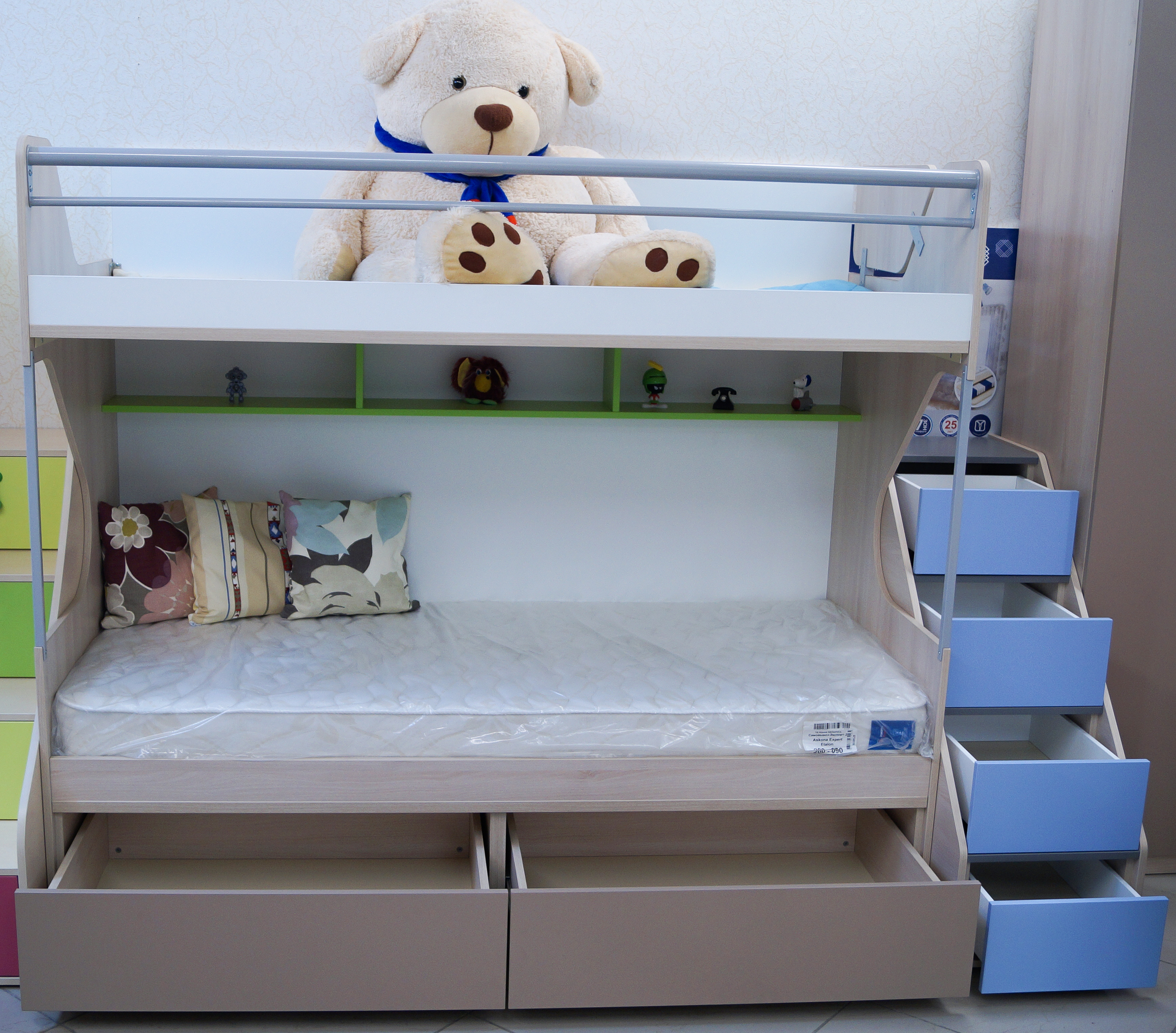 Функциональная кровать с ящиками для хранения, полкой, лестницей и бортиком.