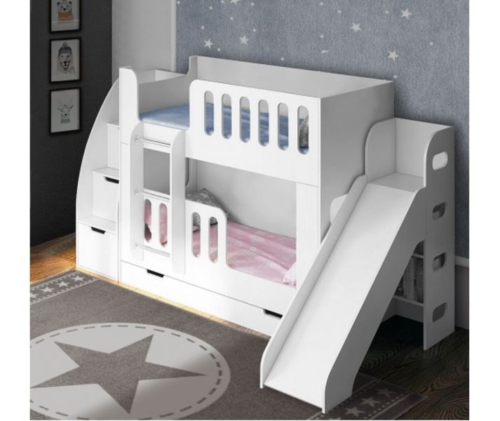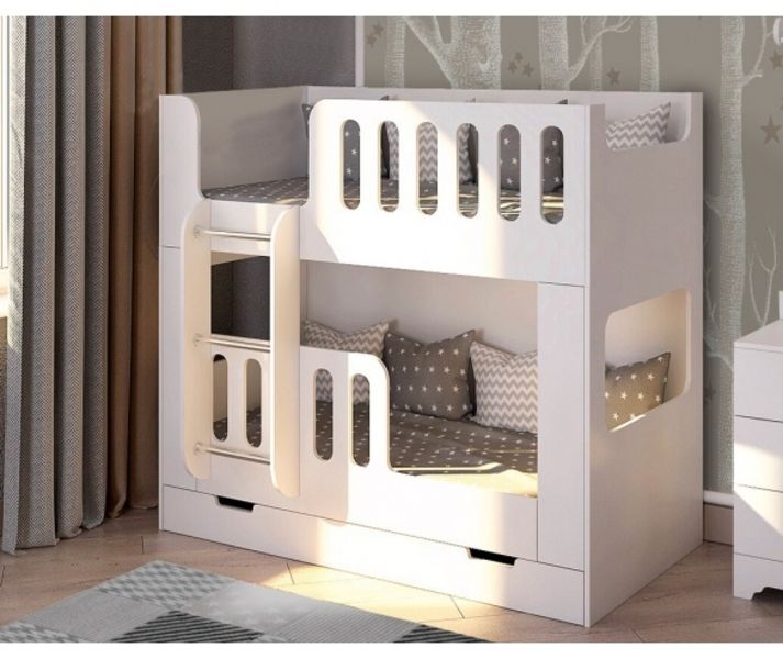 Двухъярусная кровать из массива березы «Вуди-1» с ящиками (белый)