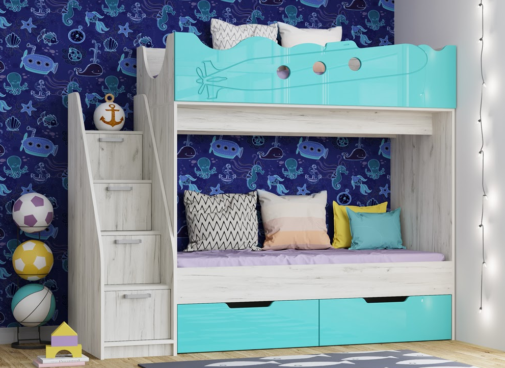 Кровать с двумя спальными местами из мебельного гарнитура в детскую комнату Юниор 15. Удобная лестница. Множество скрытых ящиков и полок. Можно заказать предметы мебели в детскую такого же цвета.