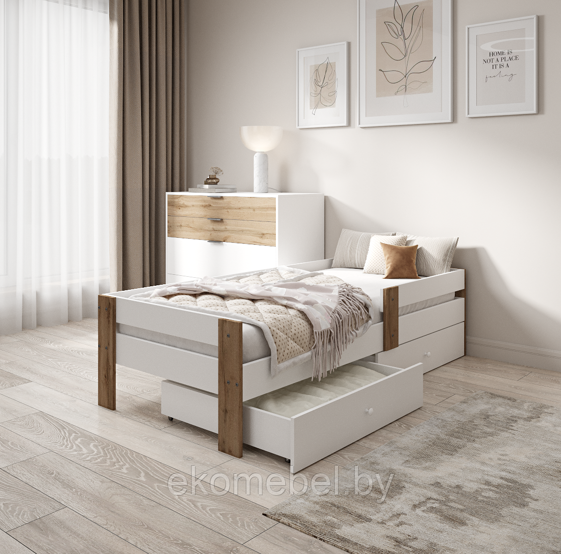 В комплекте: выдвижной ящик 3шт. Спальное место: 80х200 - 160х200 см. Материал: массив сосны.