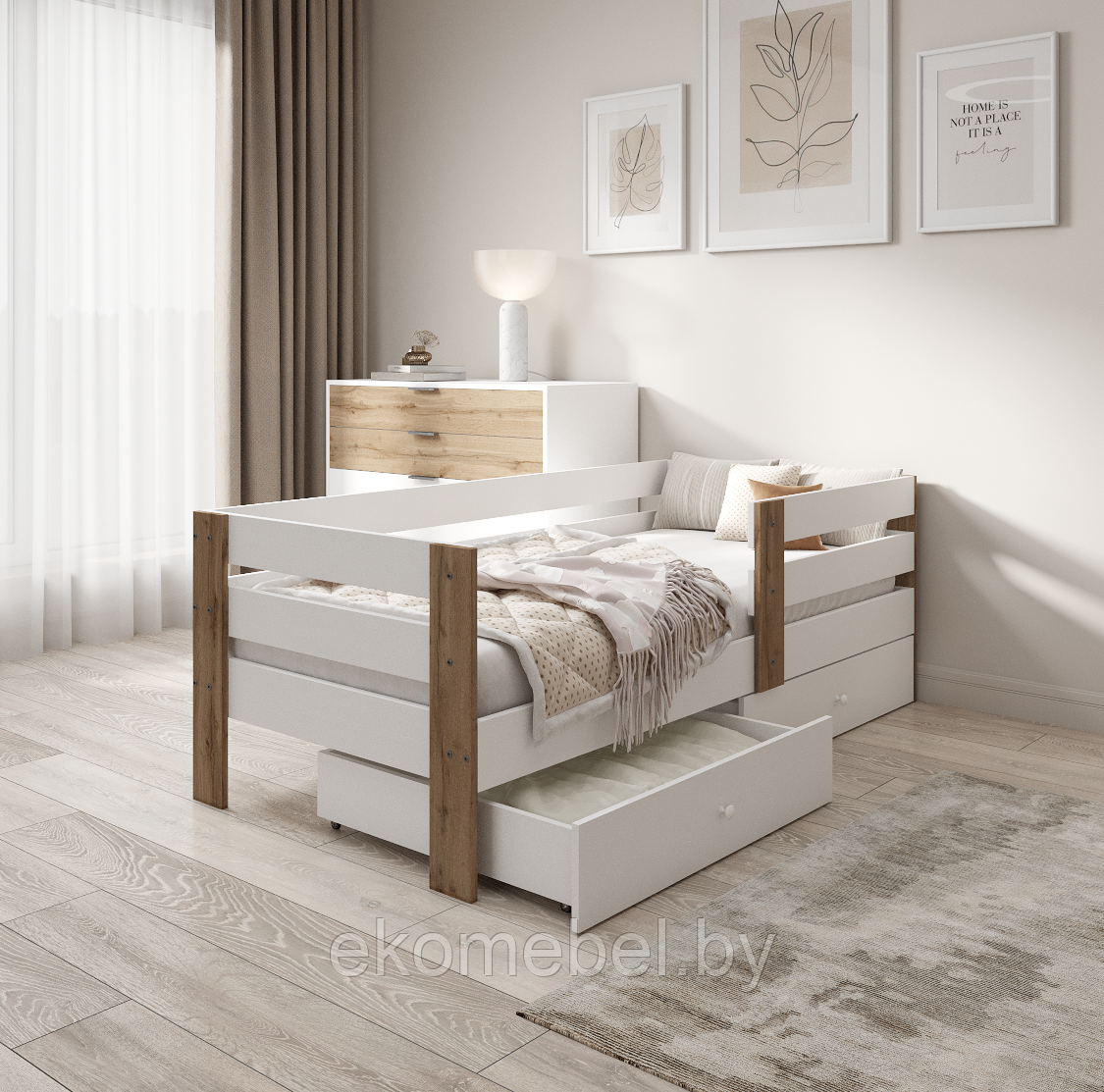 Спальное место: 90х200 см. Материал: массив сосны. В комплекте: выдвижной ящик 2шт., бортик.