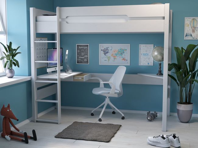 Кровать-чердак «Амелия» можно дополнить письменным столом. Две односпальные кровати Амелия легко превращаются в двухъярусную конструкцию. Также доступен защитный бортик Сиело Люмио. Ножка кровати имеет сечение 60х60, а царга — 170х20.