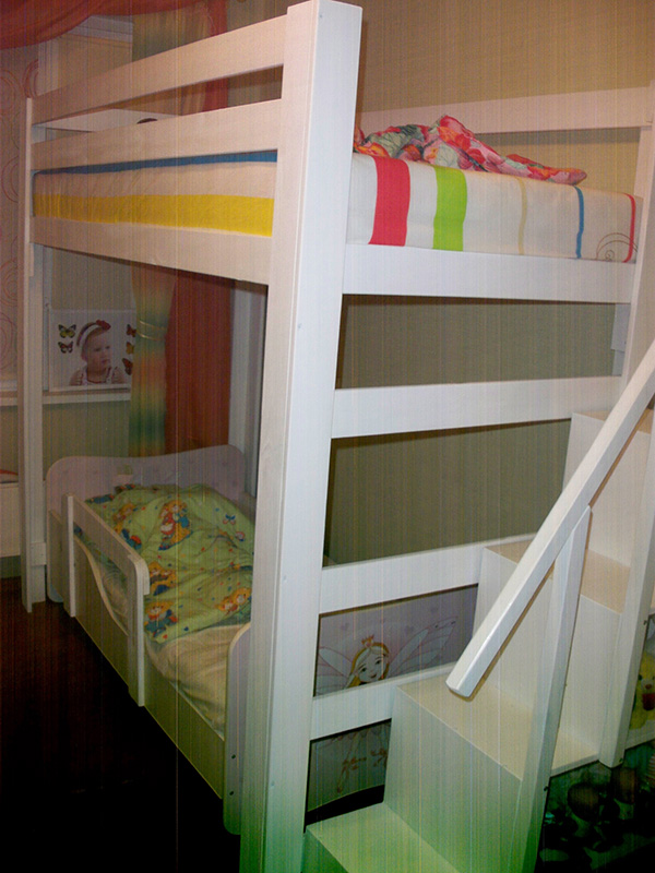 Кровать «Эрни Литтл» из массива сосны (с лесенкой и ящиками) (антик+белый)