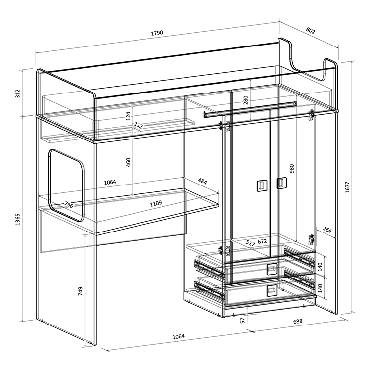 - Учебная зона со столом под спальным местом открывает возможности для письменных работ,а также здесь удобно расположить ноутбук.