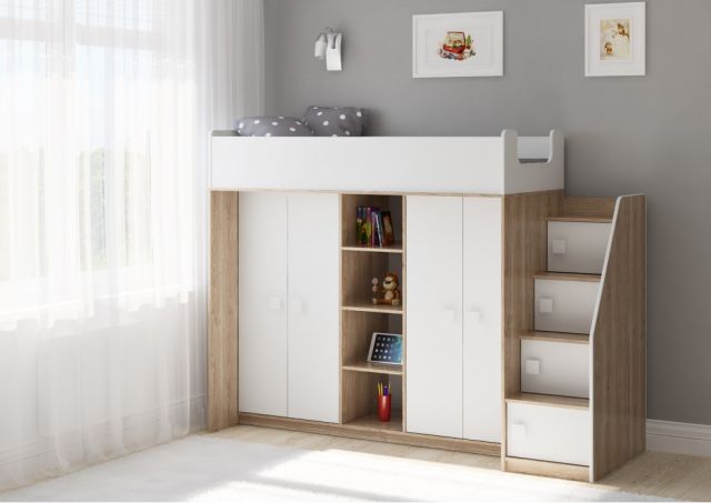 - Под спальным местом располагаются два вместительных шкафа и стеллаж между ними для хранения одежды,белья,игрушек или иных вещей.