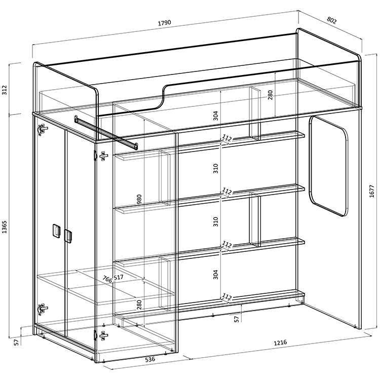 код 141662Габаритные размеры: 1790x1162x1677 мм. Игровая зона со стеллажом. Вместительный шкаф для хранения одежды.