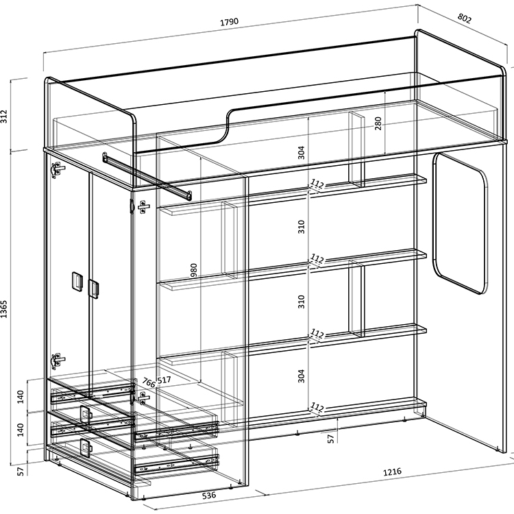 - Высота кровати чердака всего 1677 мм.
