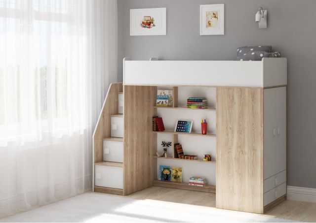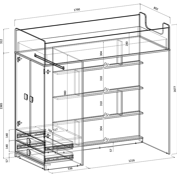 код 141670Габаритные размеры: 2246x802x1677 мм. Учебная зона со столом под спальным местом. Шкаф для одежды с ящиками.