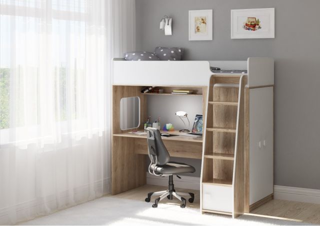 код 141667Габаритные размеры: 1790x1162x1677 мм. Учебная зона со столом под спальным местом. Шкаф для одежды.