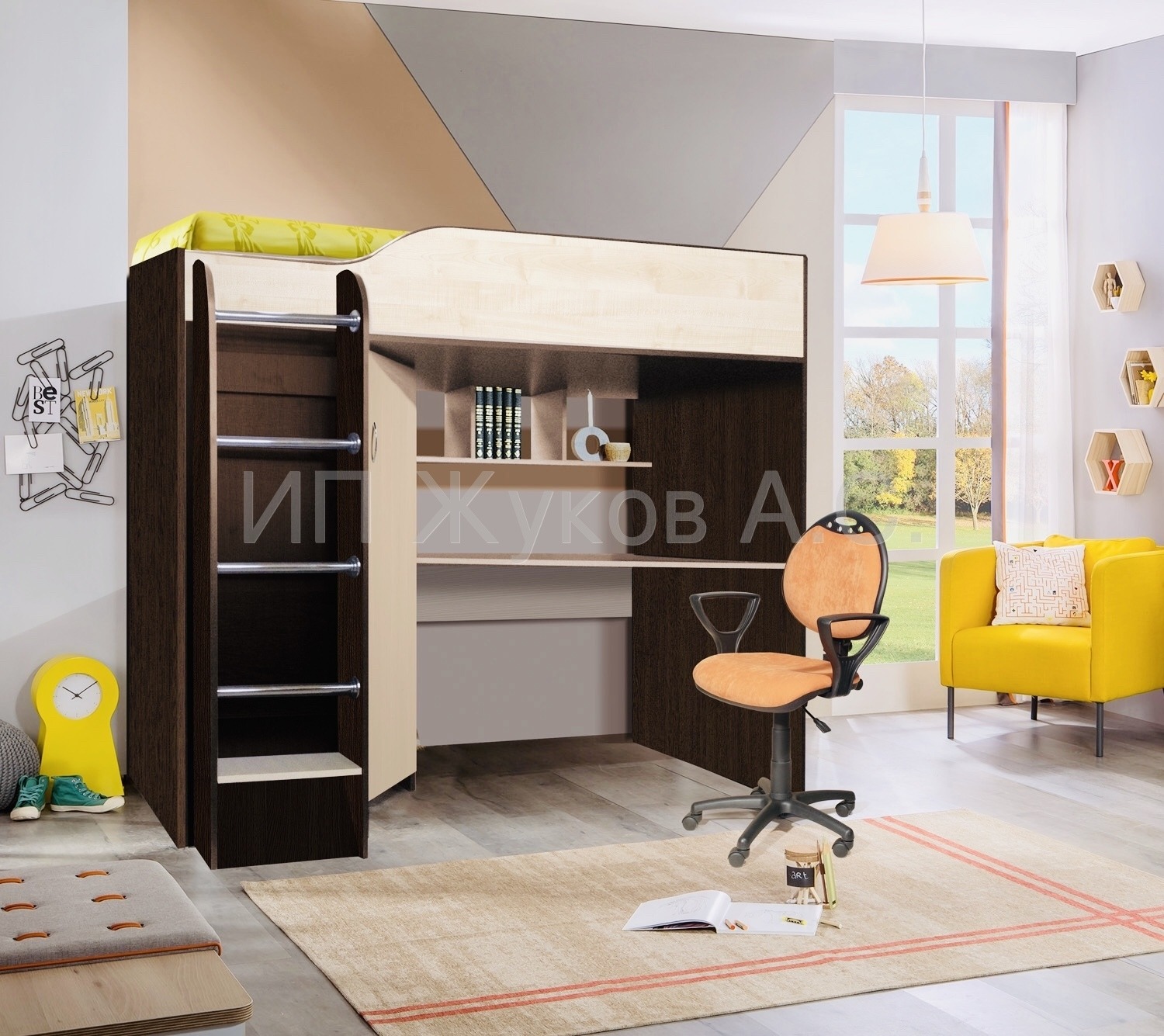 В комплект кровати чердака Малыш 06 входит: комфортное спальное место 186/80, стол для занятий, удобные полки и вместительный шкаф!