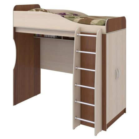 Кроме комфортного спального места конструкция включат в себя безопасную лестницу для подъема на второй ярус, удобный шкаф для одежды и длинную подвесную полку открытого типа, на которой можно хранить книги. У данной модели имеется специальная ниша для письменного стола, который вы сможете по желанию установить.