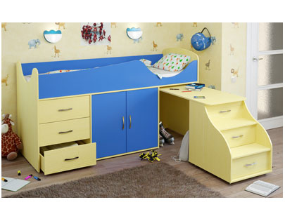 Кровать-чердак с ящиками для белья «Карлсон Мини-10» декорирована яркими голубыми фасадами, которые отлично сочетаются с корпусом светлого фисташкового оттенка. Оригинальное дизайнерское решение – фигурная лестница со ступеньками-ящиками и подставкой, которая может заменить стол.