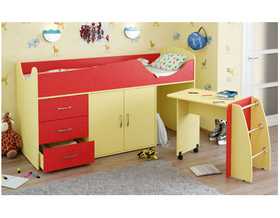 Кровать-чердак со столом «Карлсон Мини-5» – это стильная конструкция для обустройства детской комнаты. Цвет корпуса и фасадов – яркий красный и желтый. Глубокие выдвижные ящики и шкафчик комплетуются прочной фурнитурой, изготовленной из металла.