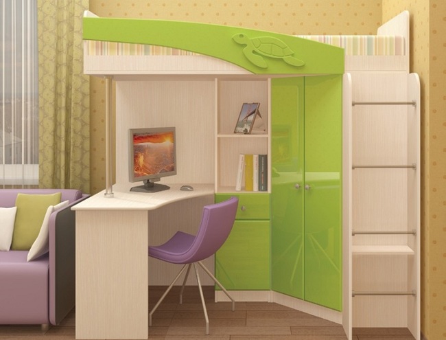 Детская кровать выделяется среди подобных из-за фактурного декора фасада в виде черепахи. На ярком корпусе гарнитура красуется стилизованное изображение этого животного. В основании кровати расположены шкаф, рабочий стол и тумба с выдвижными ящиками для учебных материалов белья или игрушек. Набор детской мебели прекрасно подойдет для малогабаритных комнат. Данная модель представлена в широкой цветовой гамме.