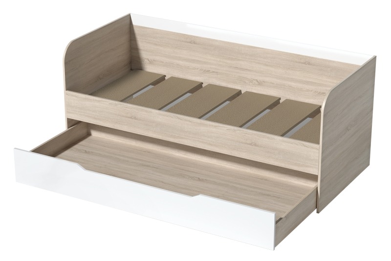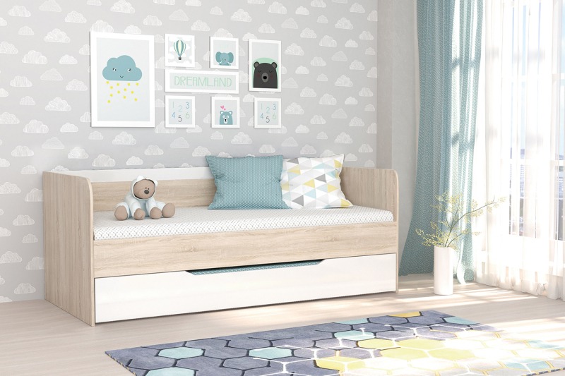 Кровать оснащена большим выдвижным ящиком, который может использоваться как в целях хранения вещей, так и в качестве дополнительного спального места. Также выдвижной ящик может использоваться ребенком как лесенка, что добавит положительных эмоций и превратит подготовку ко сну в целое приключение. Дно ящика, выполненное из ЛДСП, и ходовые ролики снизу обеспечивают прочность и надежность конструкции.