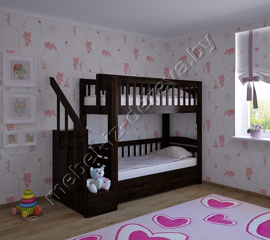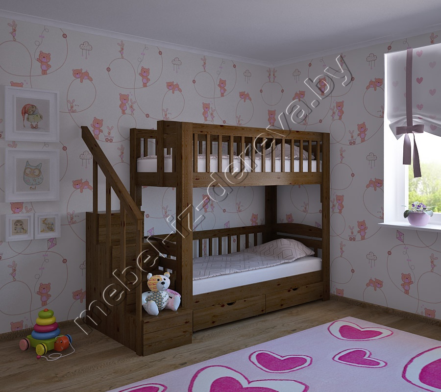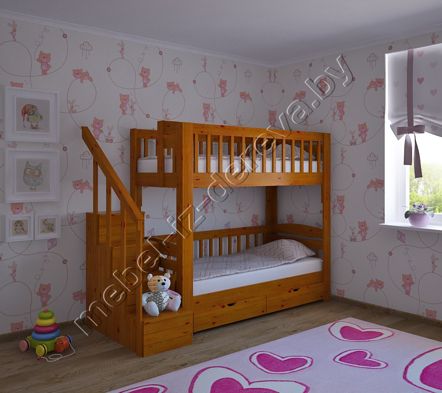 К стандартной модели для большей безопасности присоединен специальный блок с безопасными ступеньками, имеющими встроенные ниши. Для малышей дополнительной опорой служат удобные перила, прикрепленные к ступеням.За счет натурального массива кровать отличается высоким качеством и привлекательным внешним видом.