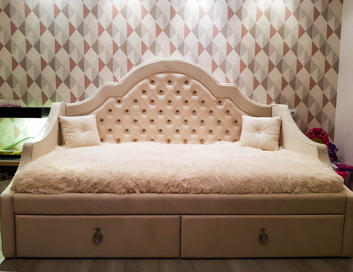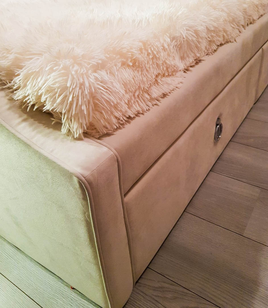 Оснащен удобным механизмом раскладки и ящиком для белья.
