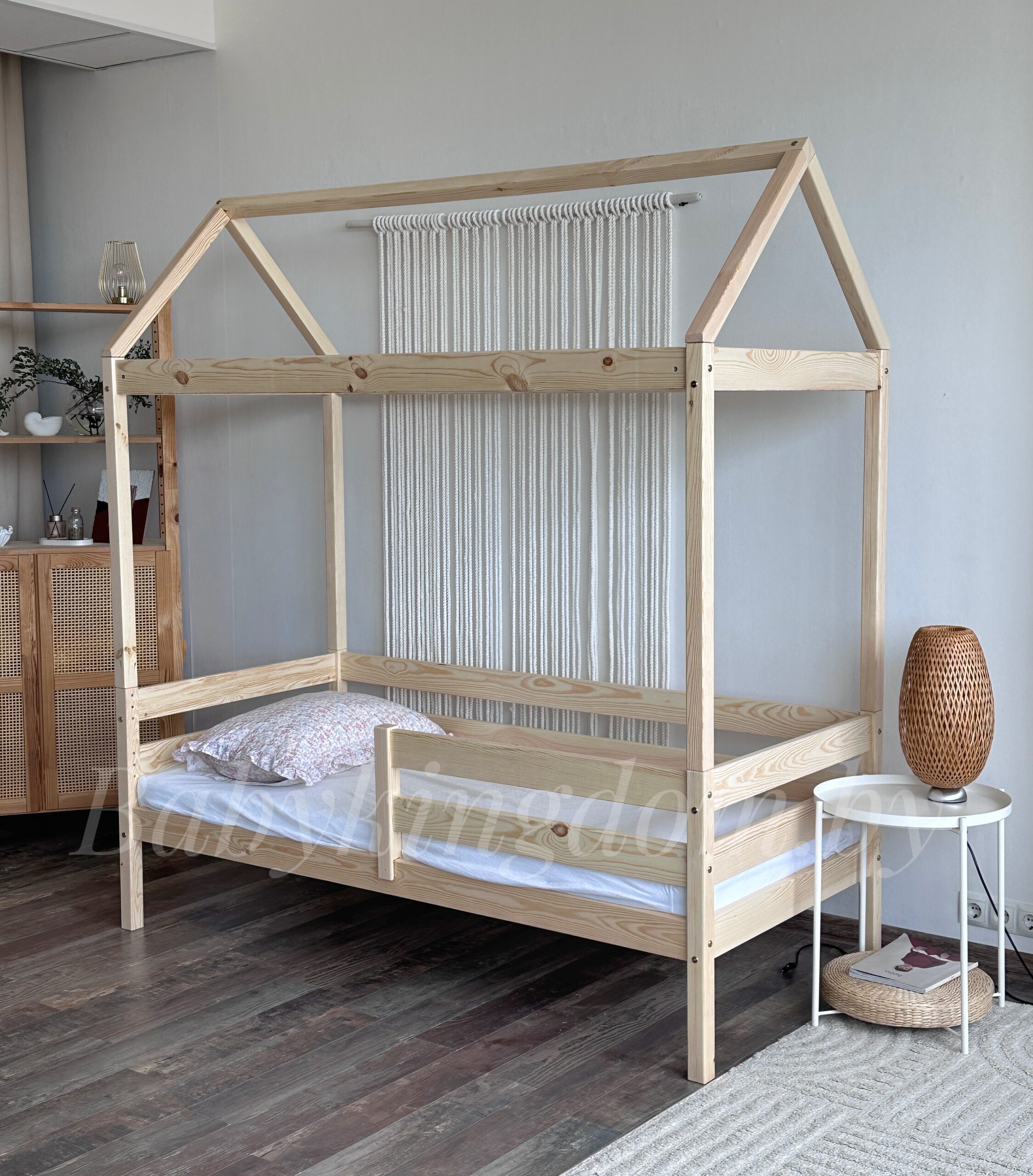 Кровать-домик может быть выполнена в двух размерах: 80х180 см и 90×200 см. Возможность снять крышу и бортик – отличное решение, ведь рано или поздно “детская” кровать может надоесть. Легким движением руки вы превратите кровать-домик в обыкновенное спальное место – ваш подросток это оценит!