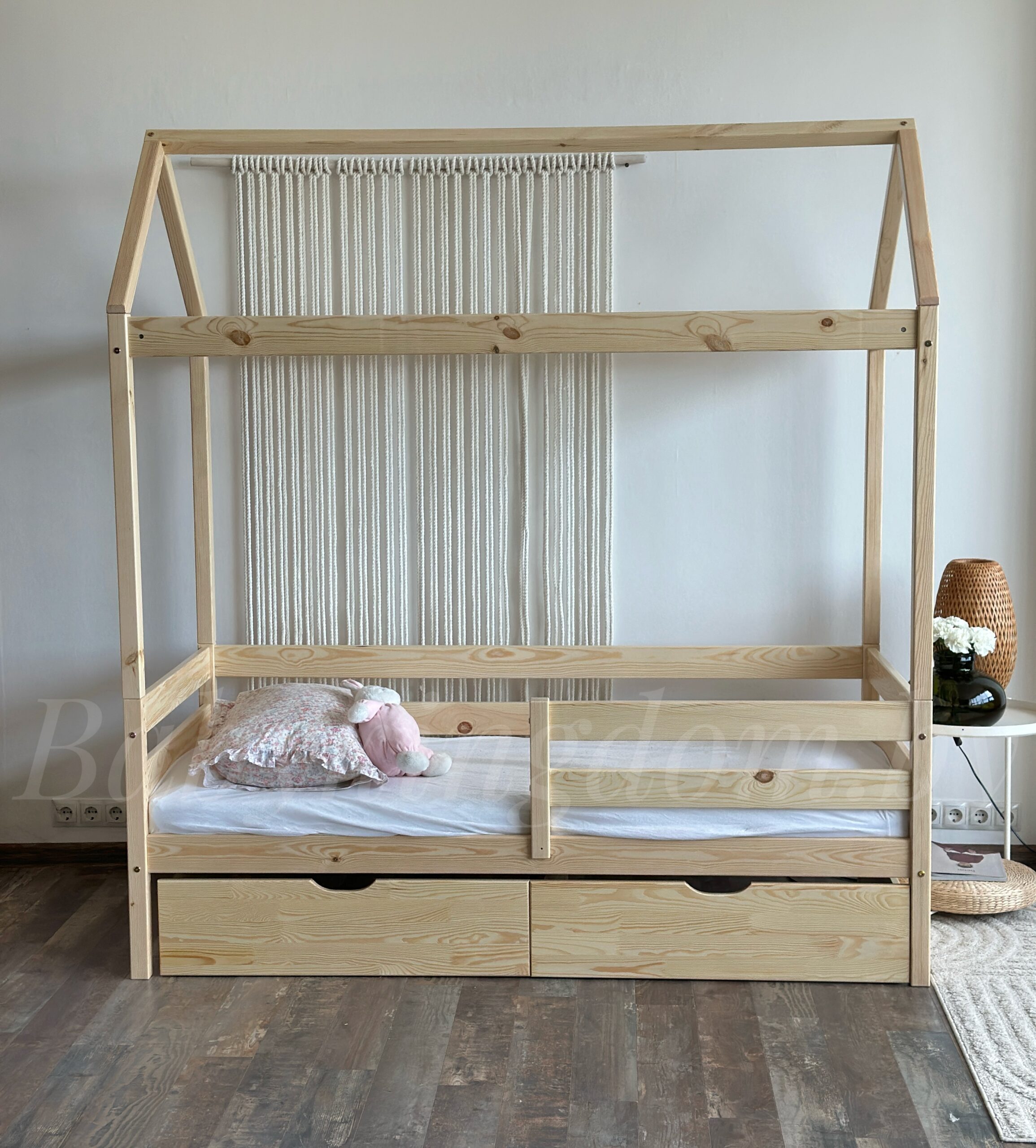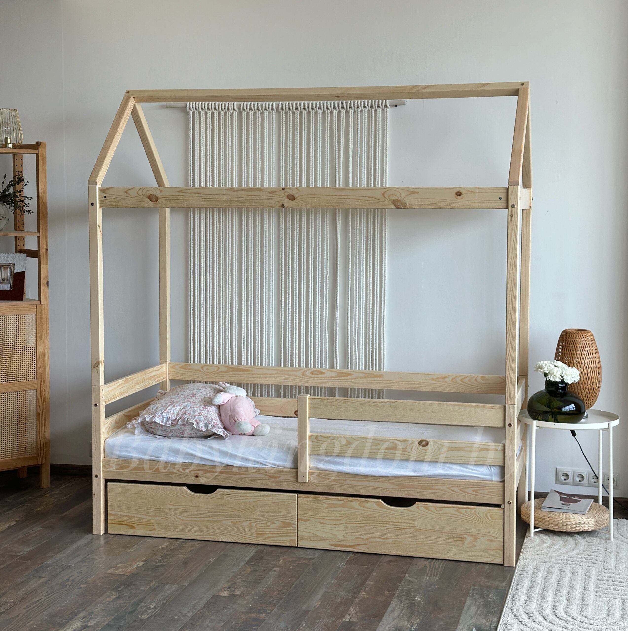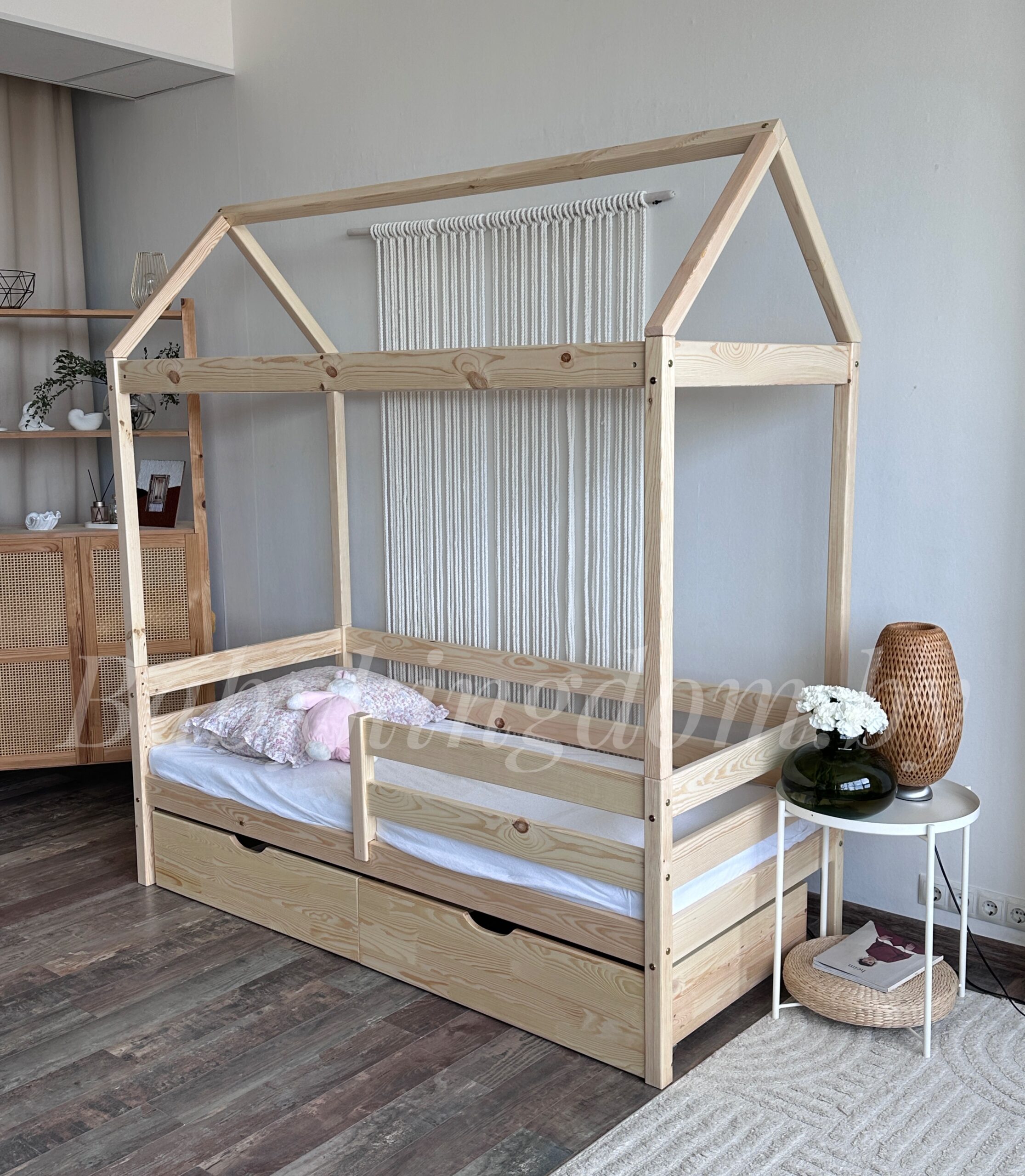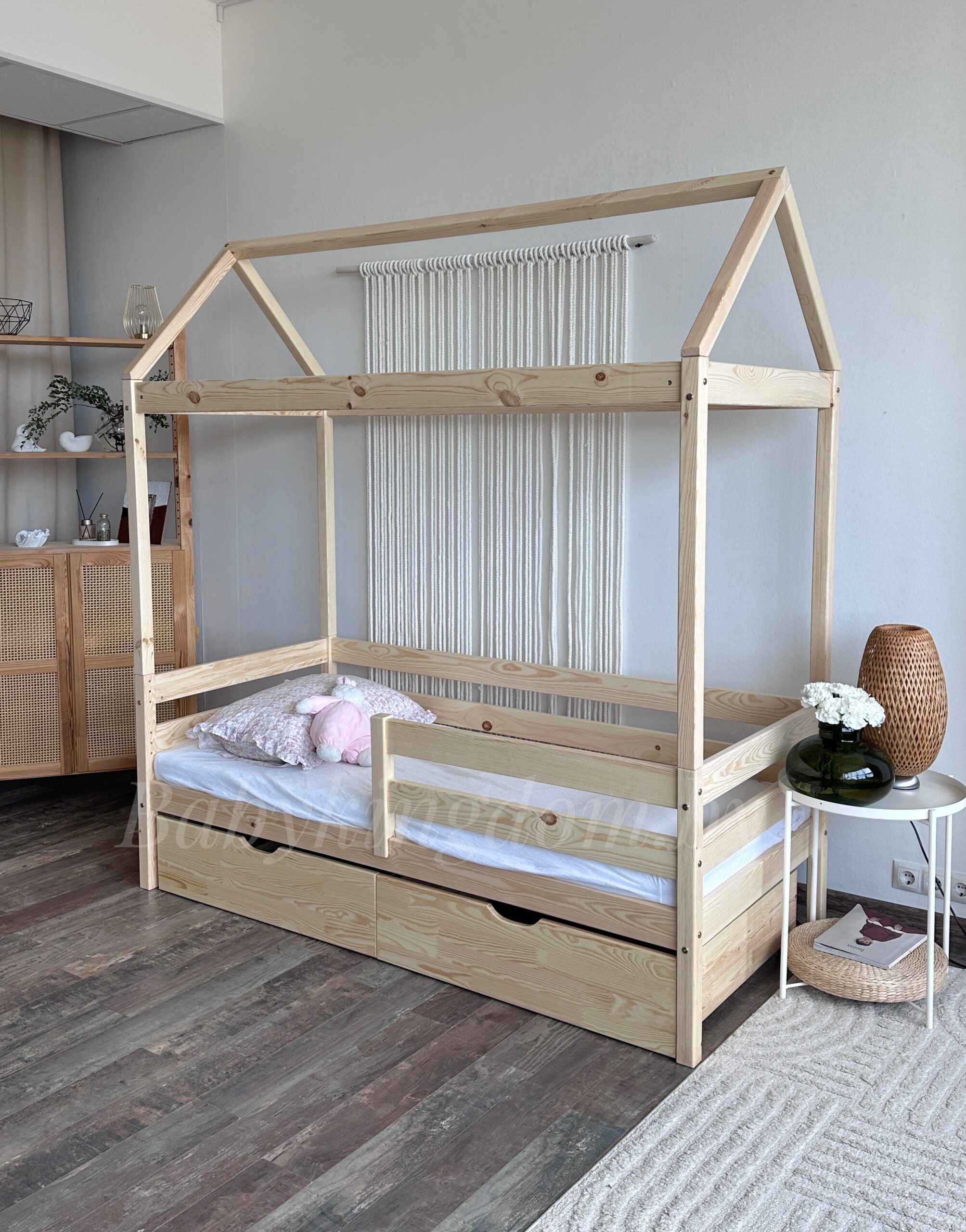Данная модель кровати-домика может быть выполнена в двух размерах: 80х180 см и 90×200 см. У кровати съемная крыша и борт, а также два выдвижных ящика, в которых удобно хранить постельные принадлежности, игрушки, вещи. Другие размеры кровати-домика приведены ниже.