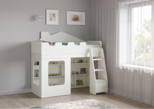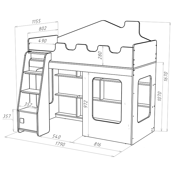 - Особенностью этой модели является наличие прямой лестницы с дверцей, которая не только придает кровати-домику особый шарм, но и обеспечивает легкий и безопасный доступ к спальному месту. Стеллаж, расположенный внизу спального места, предоставляет дополнительные возможности для хранения вещей и игрушек.