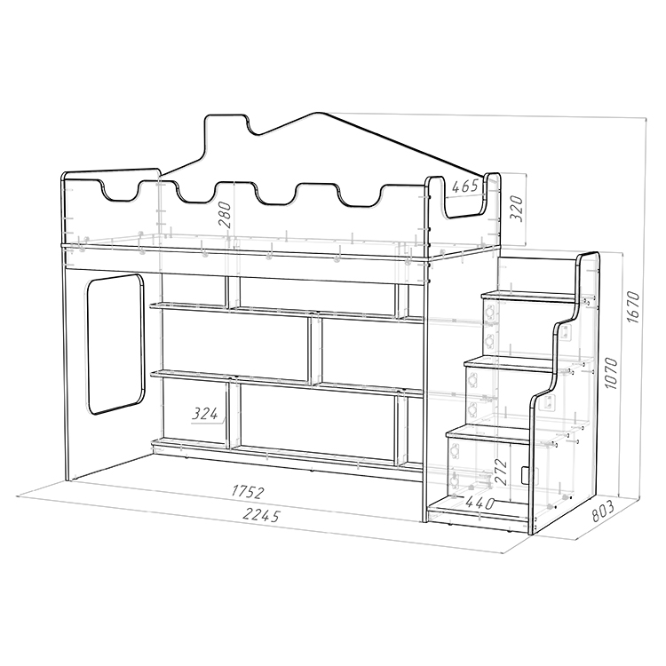 - Угловая лестница с тремя дверцами обеспечивает комфортный и безопасный подъем к спальному месту и дополнительные места хранения. Вместительный стеллаж под кроватью предоставляет дополнительное пространство для хранения различных предметов и игрушек.