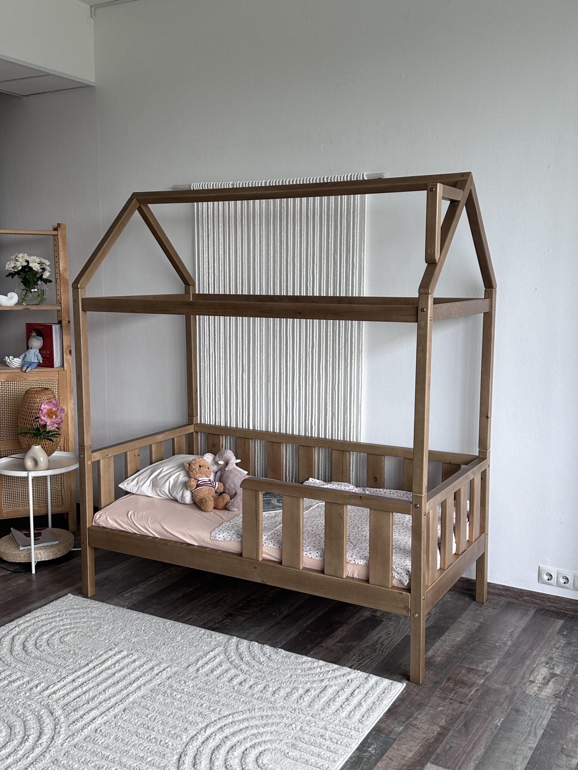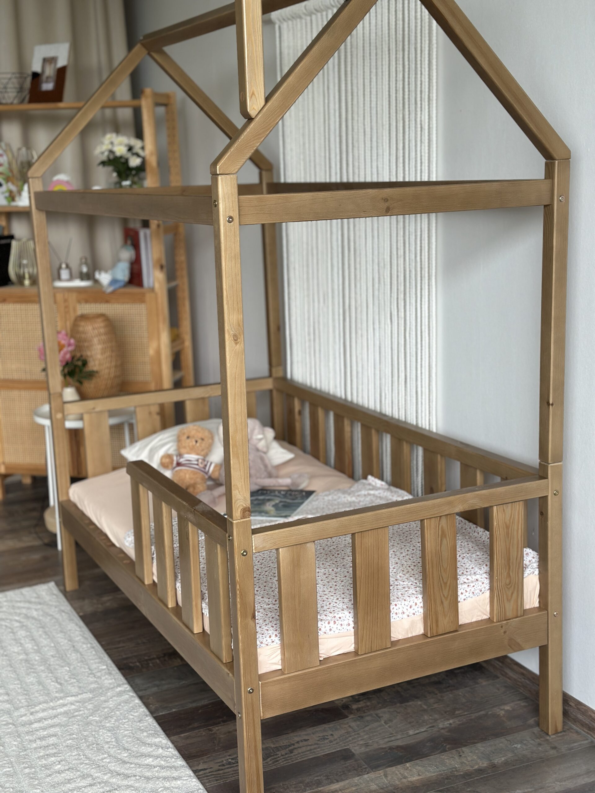 Данная модель покрыта прозрачным лаком, который лишь подчеркивает натуральный цвет древесины. Кровать “Киндер Люкс” доступна для заказа с размером спального места 80х160 см. Кроватка-домик подойдет для малышей от 2 до 10 лет.