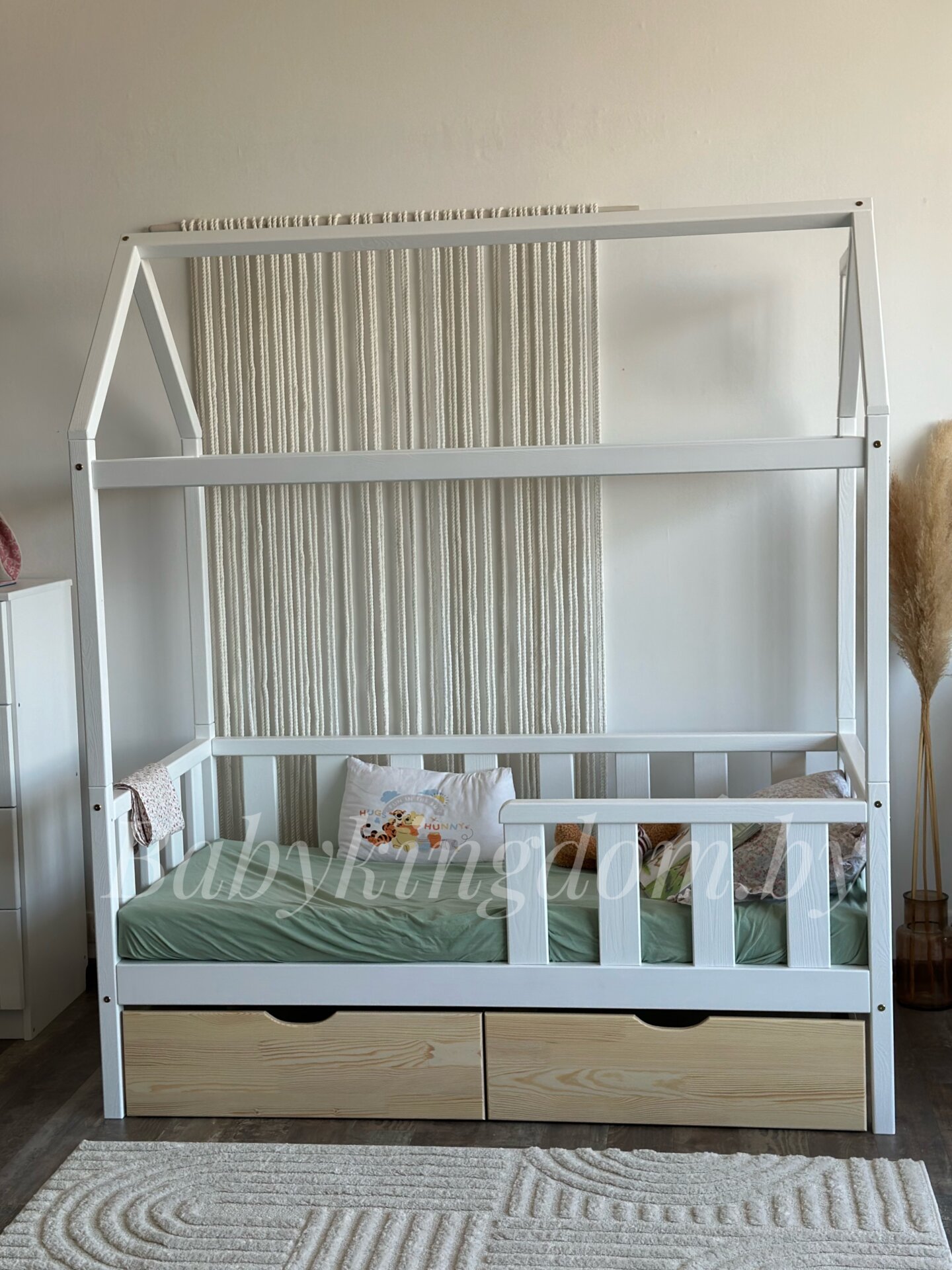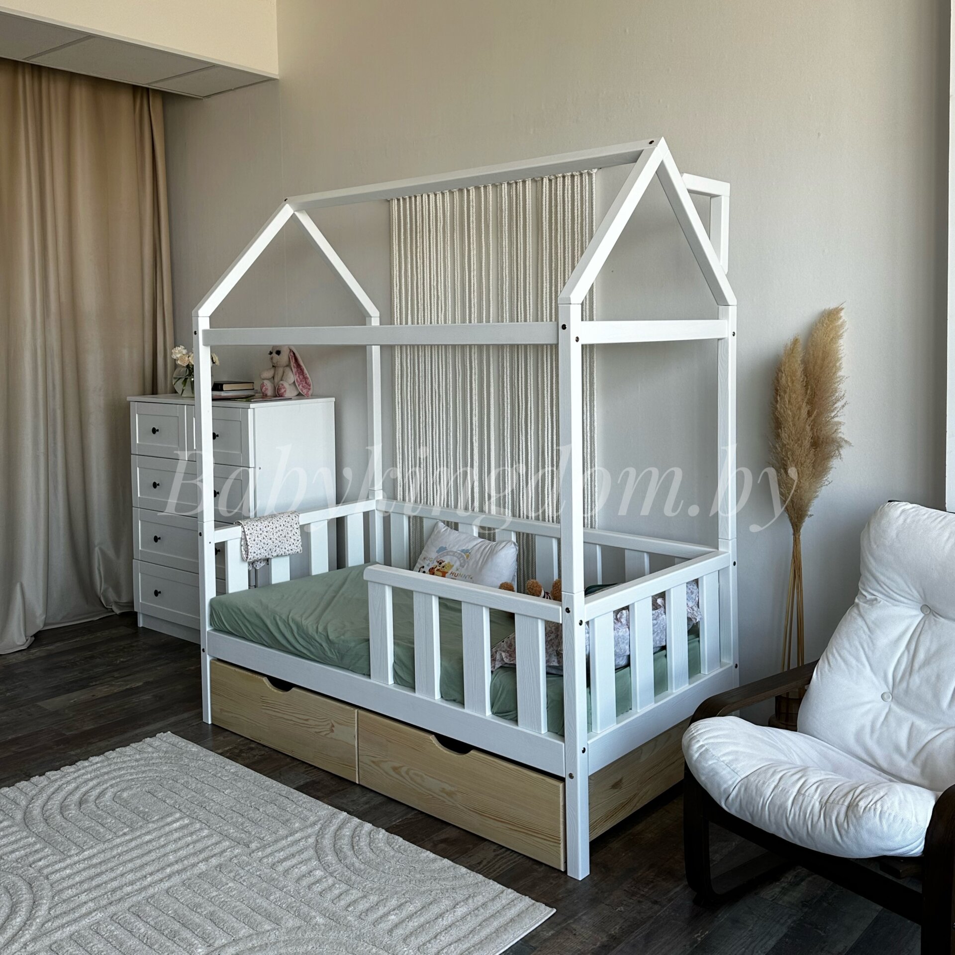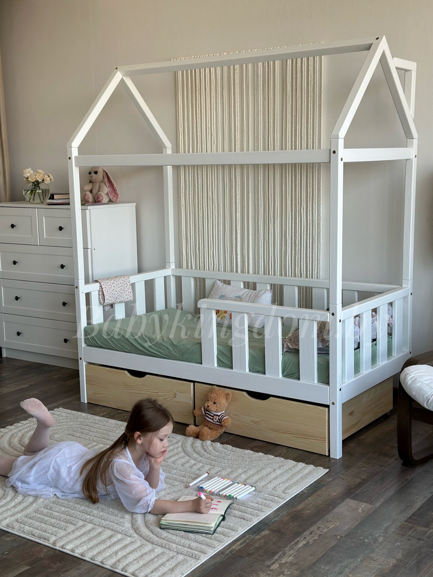 Кровать-домик из массива сосны «Киндер Люкс» 160х80 с ящиками (белый/лак)