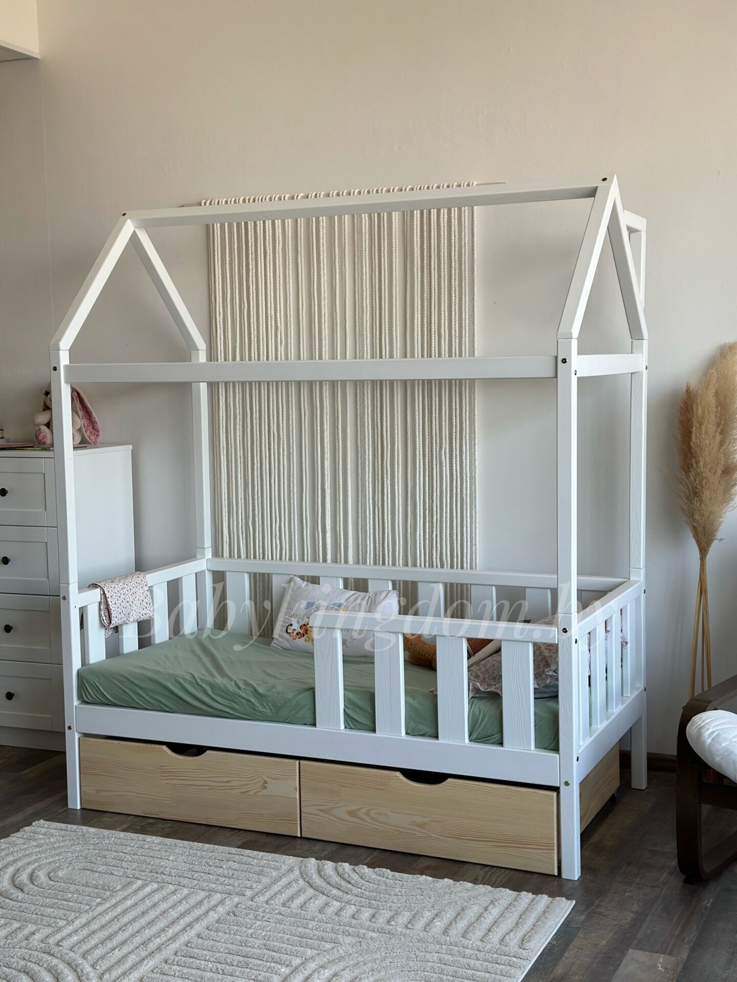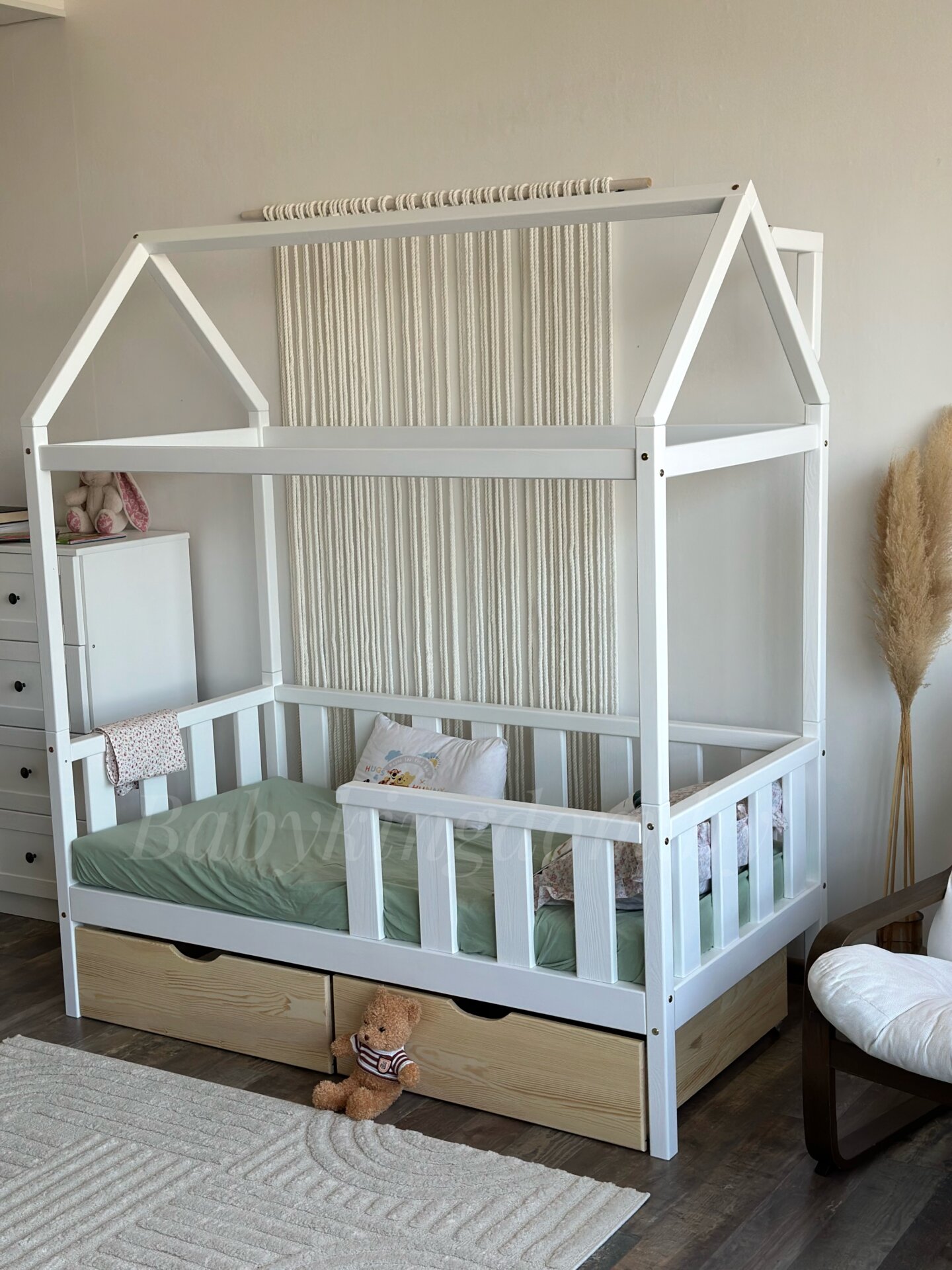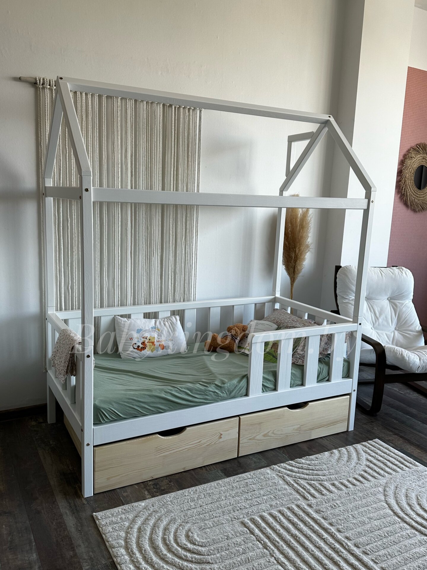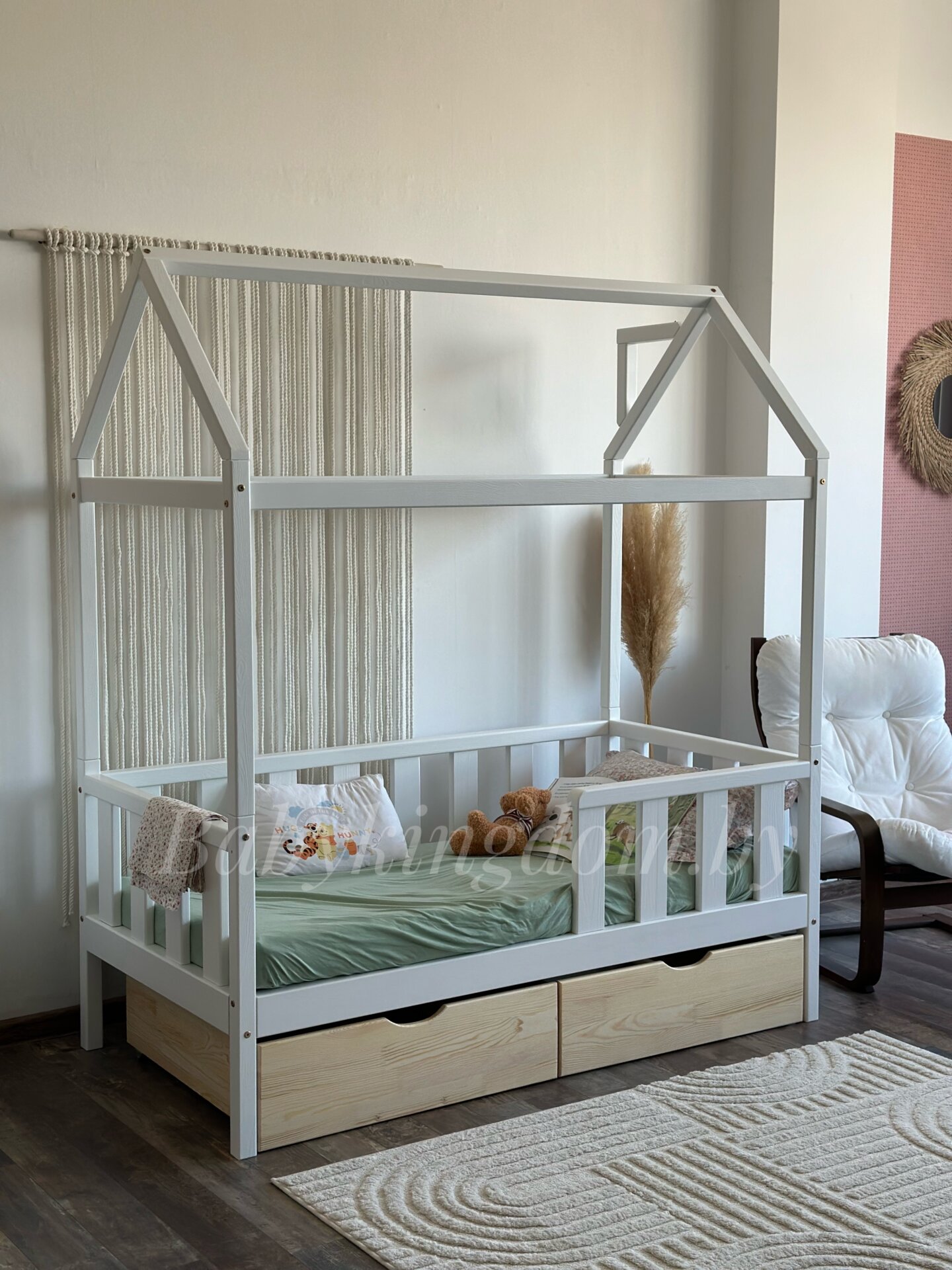 Кровать-домик из массива сосны «Киндер Люкс» 160х80 с ящиками (белый/лак)