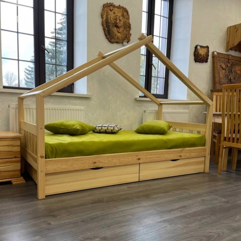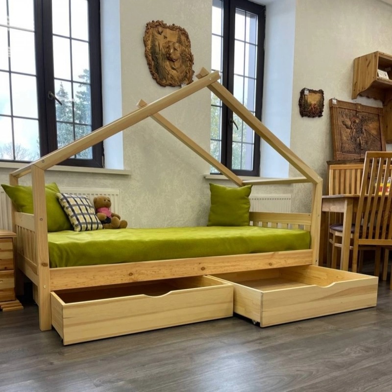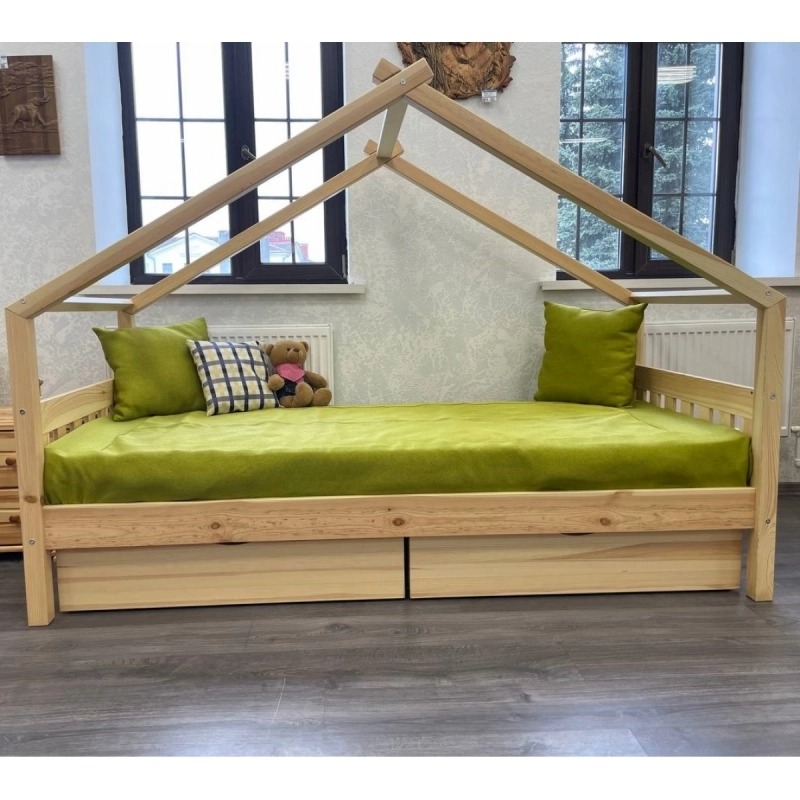 Кровать-домик из массива сосны «Киндер Люкс» 160х80 с ящиками (белый/лак)