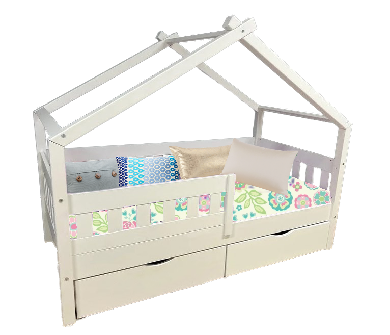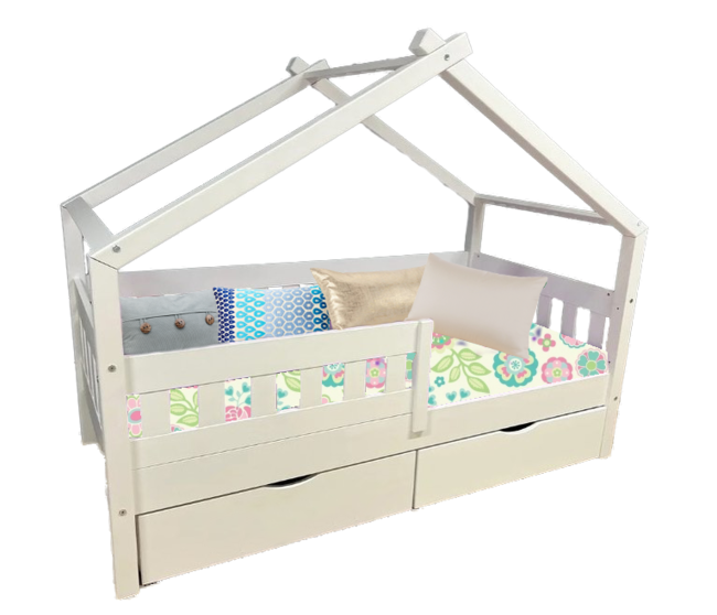 Кровать-домик из массива сосны «Киндер Люкс» 160х80 с ящиками (лак/белый)
