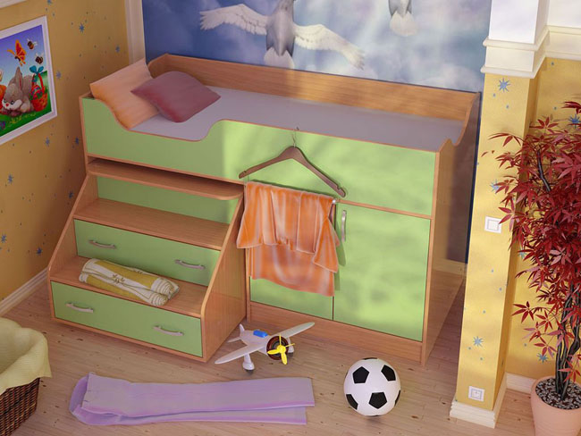 Кровать «Антошка-Микро» представляет конструкцию из кровати, установленную на небольшой шкаф и лестницу в виде выдвижных тумбочек. Модель двухъярусной кровати может быть изготовлена в двух цветах: салатовый или голубой в сочетании с цветом бук. Такая конструкция – это новое поколение в интерьере детской комнаты, которое экономит пространство и денежные затраты.