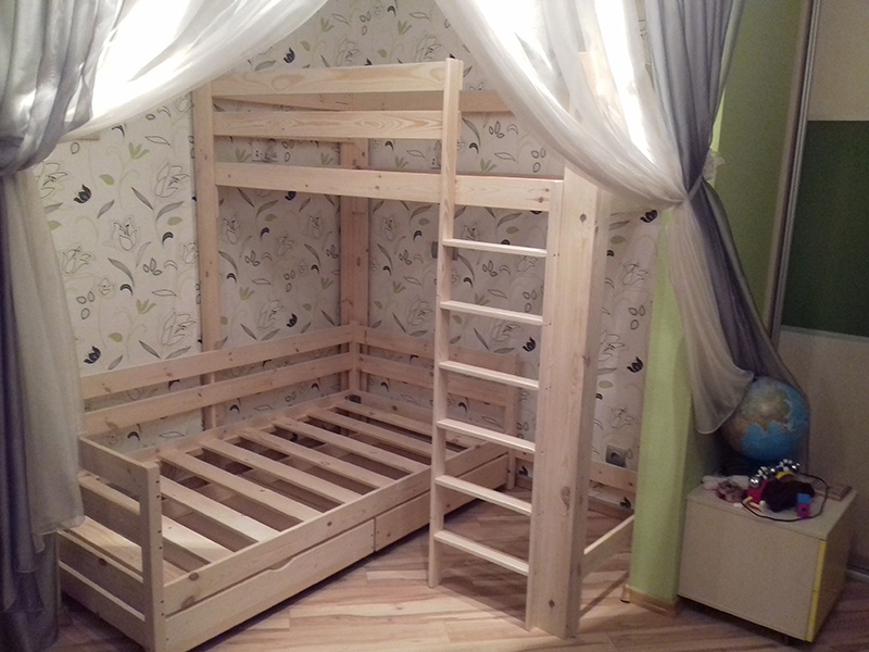 Спальные места: 90х200 и 140х200 см. Материал: массив сосны.