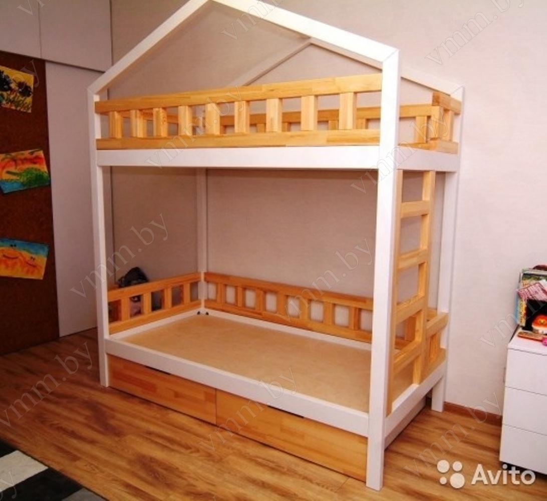 Двухъярусная кровать домик из массива сосны «Вуди-5» с ящиками