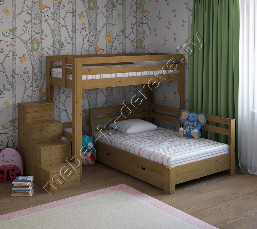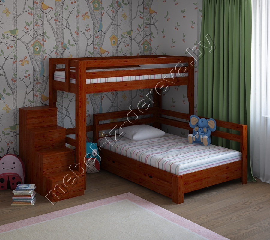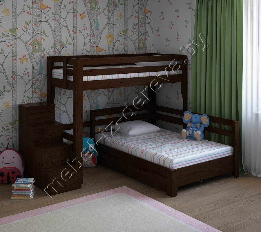 Многофункциональная кровать-чердак укомплектована двумя комфортными спальными местами. Для подъема на верхний ярус предусмотрено наличие ступенек с вместительными нишами. Нижний ярус снабжен несколькими выдвижными ящиками для хранения постельного белья или игрушек. Расположение кроватей можно изменять по усмотрению покупателя. Нижний ярус можно разместить параллельно верхнему этажу.