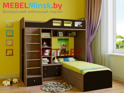 Двухъярусная кровать выполнена в угловом исполнении, которое позволит разделить детскую комнату на спальную, игровую и рабочую зоны. Под верхней кроватью расположены полки и комод. Двустворчатый платяной шкаф со штангами позволит сэкономить пространство. Материал изготовения ЛДСП, цветовое исполнение на выбор.