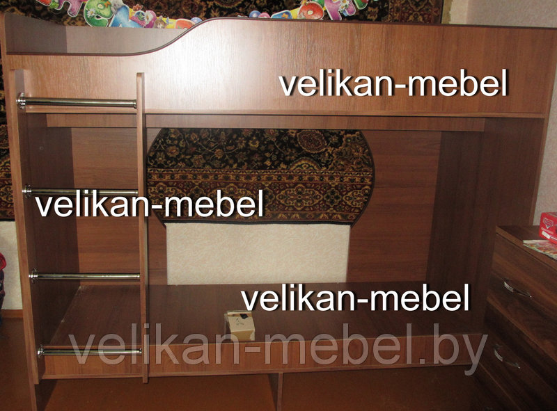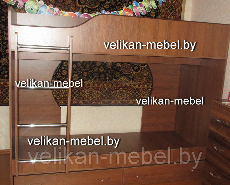 Кровать детская двухъярусная с выкатными шуфлядами из ЛДСП.