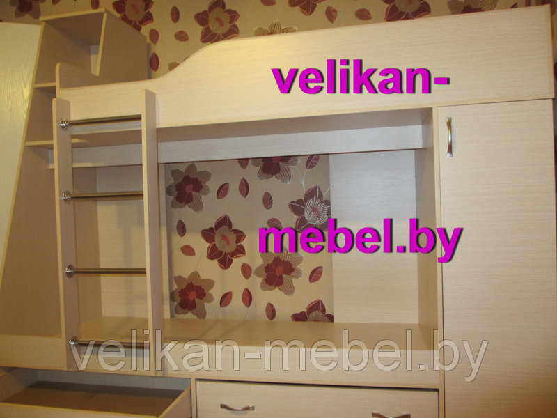 Кровать детская двухъярусная с выкатными шуфлядами из ЛДСП, модель с боковым шкафом и полками для книг.