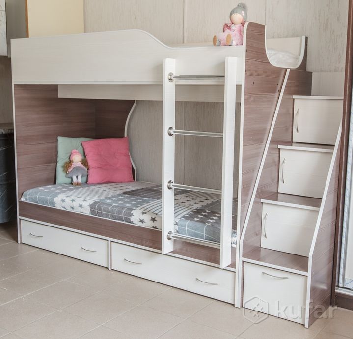 Кровать оснащена лестницей с хранением, угловым шкафом и рабочей зоной.