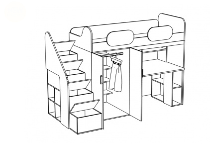 Двухъярусная кровать «Mio 6» состоит из удобной кровати, небольшого шкафа для одежды, эргономичного стола с полками-нишами и лестницы. Все элементы изготовлены из ламинированной ДСП и окрашены в два оттенка: голубой и дуб выбеленный.