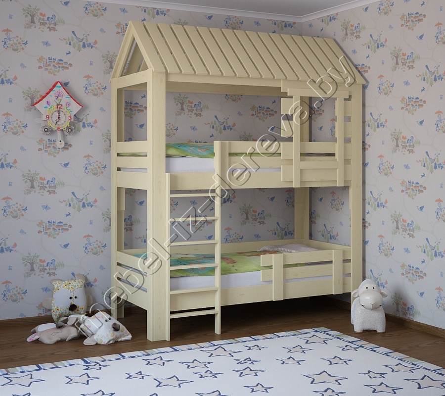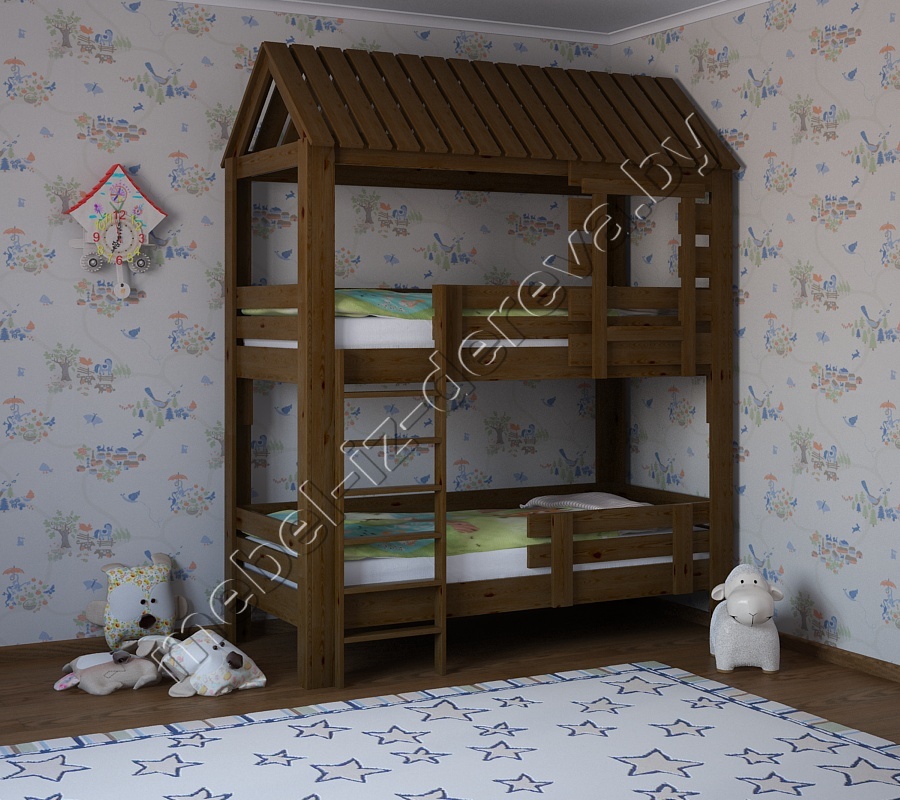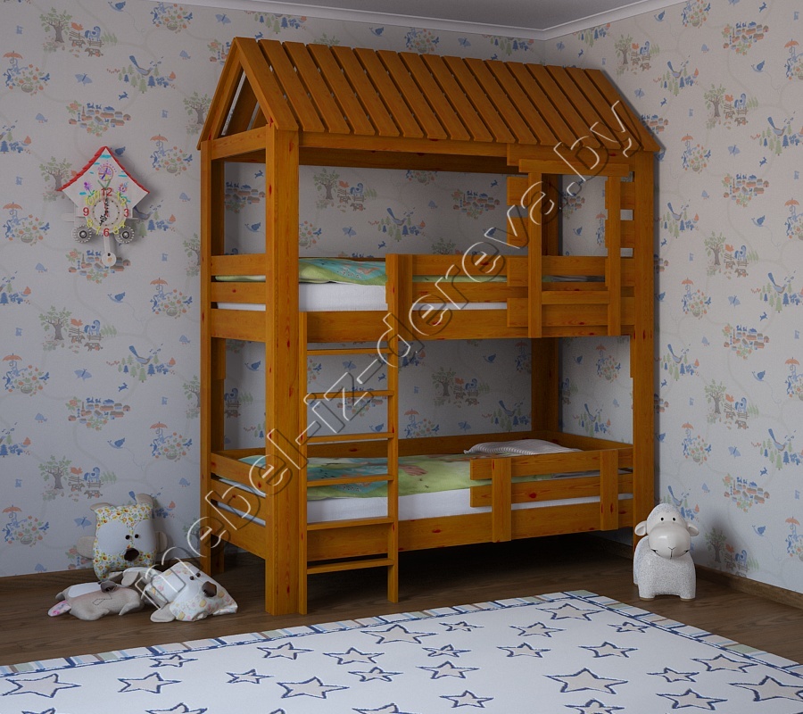 Данная двухъярусная кровать станет настоящим украшением комнаты ваших детей. Кровать выполнена в стиле игрового домика с настоящей крышей и небольшими окошками. Такая модель отлично подойдет для комнаты, как мальчика, так и девочки. Комфортная лестница для подъема на второй этаж может быть закреплена с любой из сторон конструкции.
