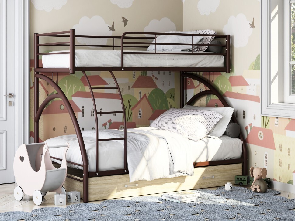 Металлическая двухъярусная кровать Виньола-2 с ящиком способна выдерживать нагрузку до 300 кг (на одно спальное место), что делает ее подходящей как для детей, так и для взрослых.