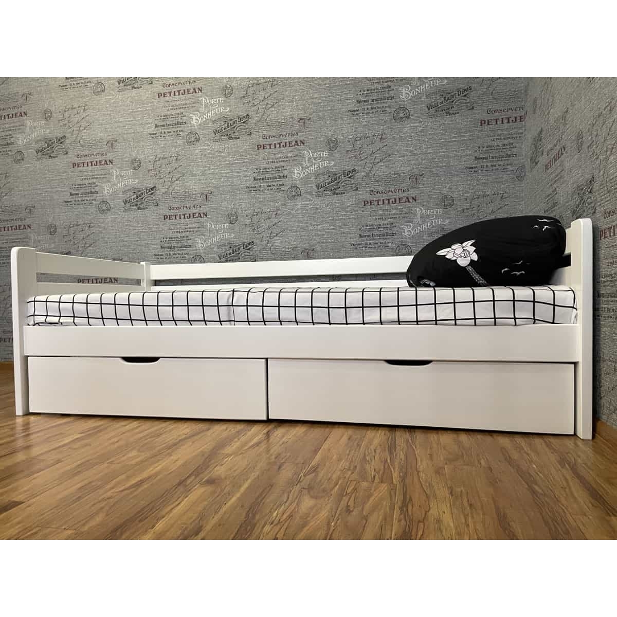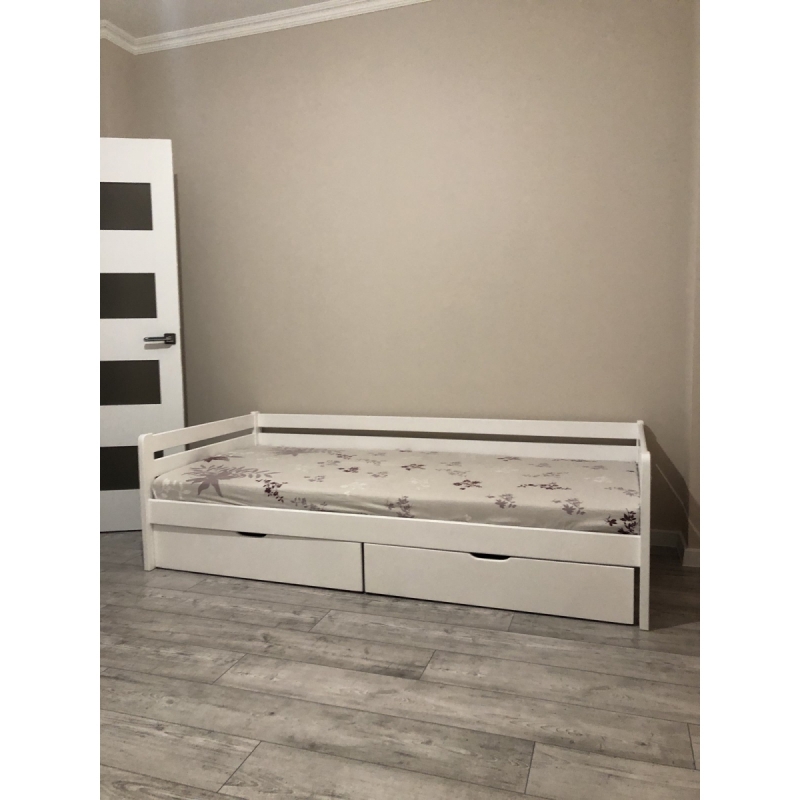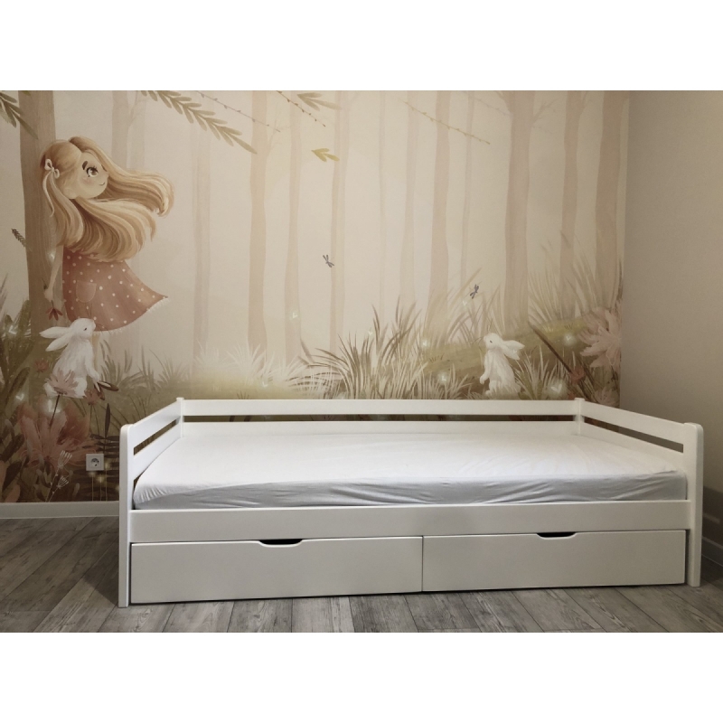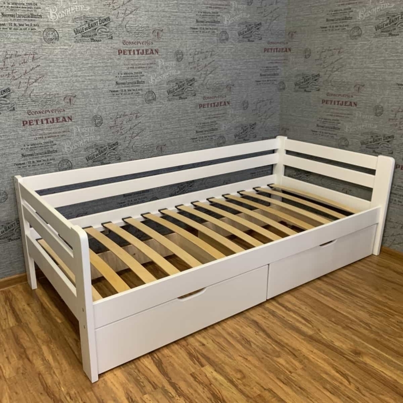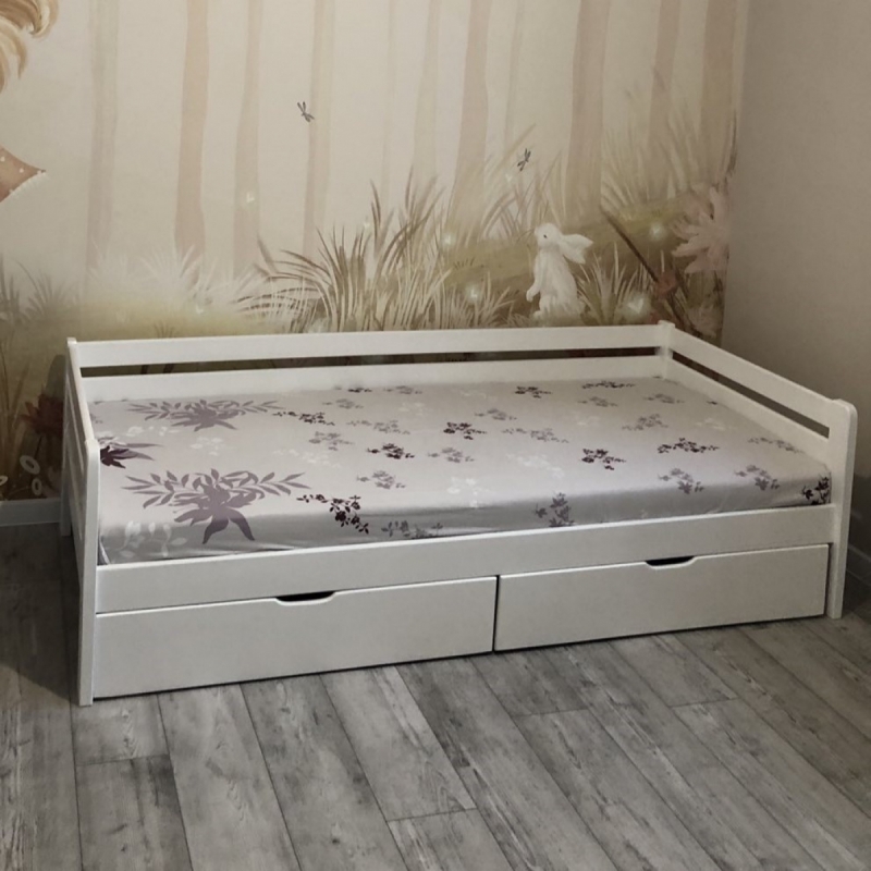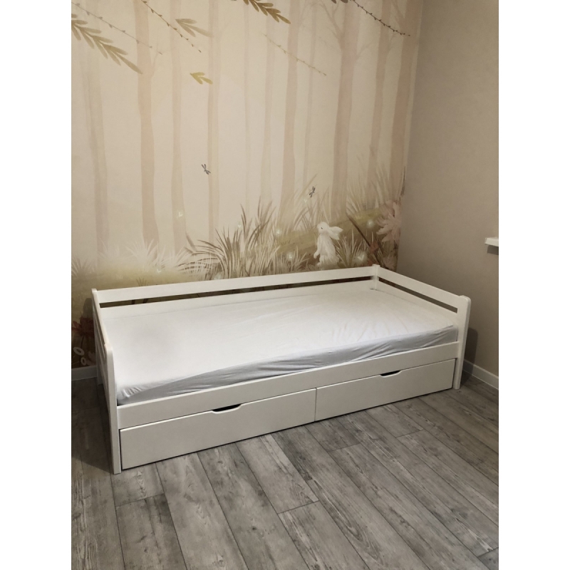 Спальное место: 90х200 см. Материал: массив сосны. В комплекте: выдвижной ящик 2шт., бортик.
